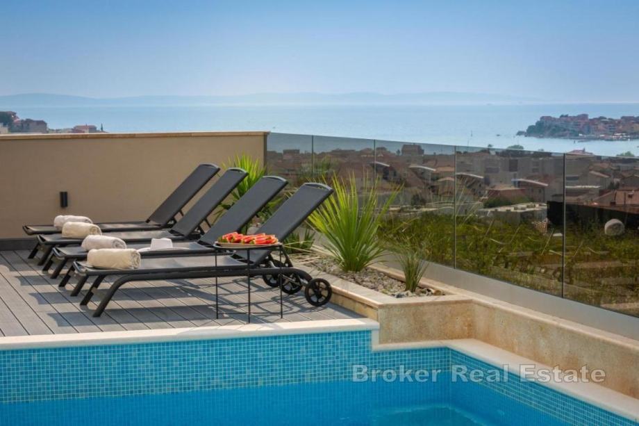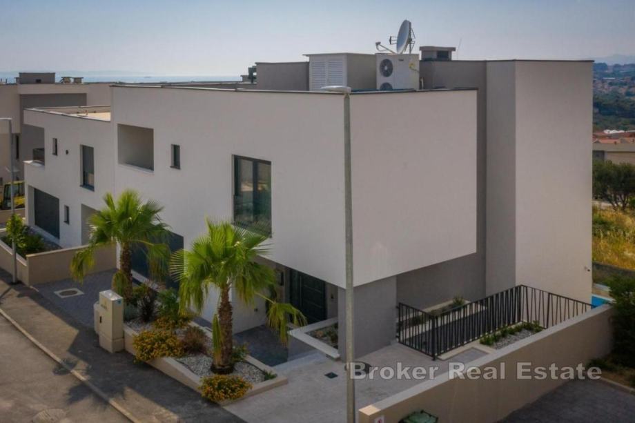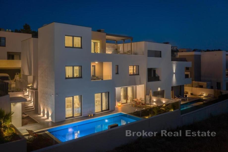 U ponudi je ekskluzivna vila za najam koja ima panoramski pogled na kristalno čisto more i nalazi se u blizini Splita. Pozicionirana je na južnoj strani te odiše najvišom udobnošću, modernim interijerom i elegantnim dizajnom. Nudi idealan, moderan ambijent uz jedinstven pogled na mediteransku obalu. Uz veliku pažnju posvećenu detaljima interijera i eksterijera, modernoj tehničkoj opremi, najnovijim građevinskim materijalima i čarobnim dodirom glamura, ova vila pruža luksuzni odmor za svaku obitelj. Izgrađena je na tri etaže.