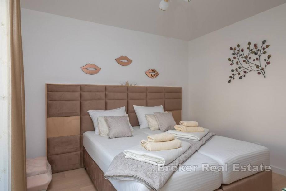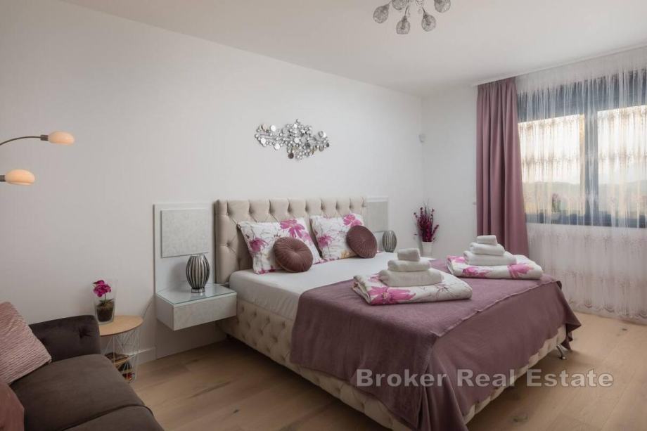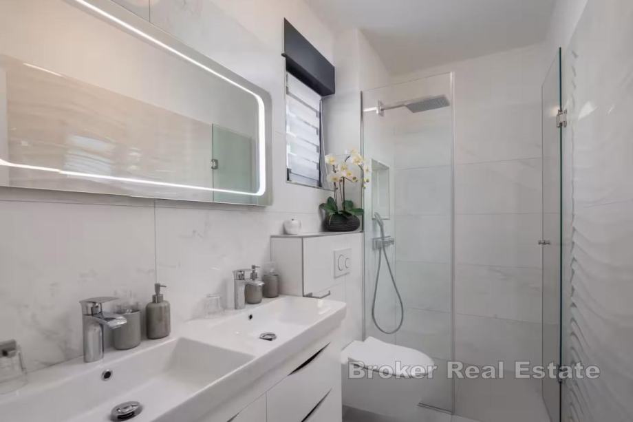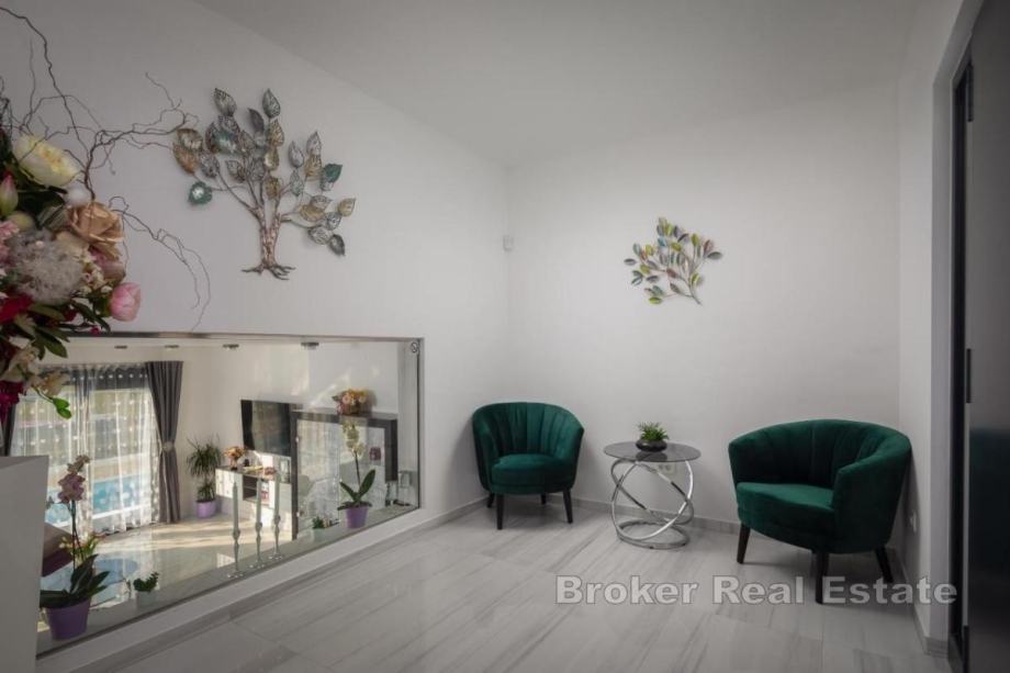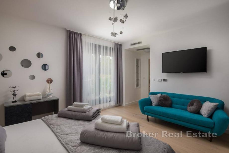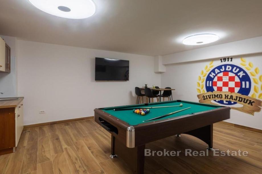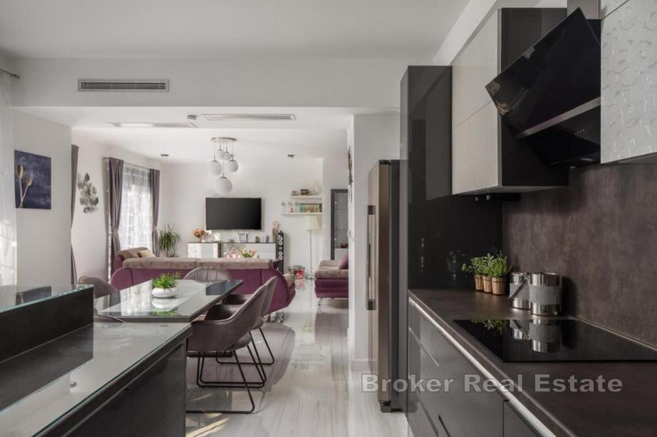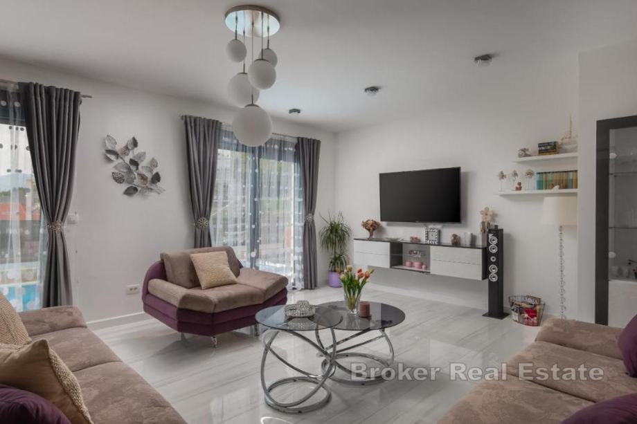 Sastoji se od dnevnog boravka i kuhinje, 4 prostrane sobe, 4 kupaonice, bazena i kvalitetnog vrtnog namještaja s roštiljem za pripremu delicija, privatnog parkinga, balkona te otvorene i djelomično natkrivene terase.