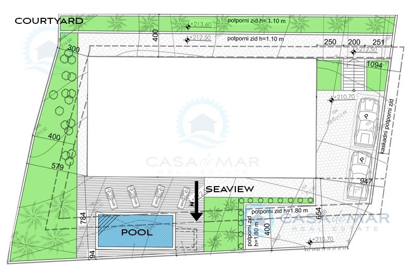 Na okućnici površine 723 m² smješteni su bazen dimenzija 7x3 m, sunčalište, natkrivena terasa, ljetna kuhinja te ugodna lounge zona okružena mediteranskim biljem i palmama – idealan prostor za ljetna druženja i potpunu privatnost. Dva privatna parkirna mjesta osiguravaju jednostavnost svakodnevnog boravka, uz mogućnost dogovora za izgradnju garaže.