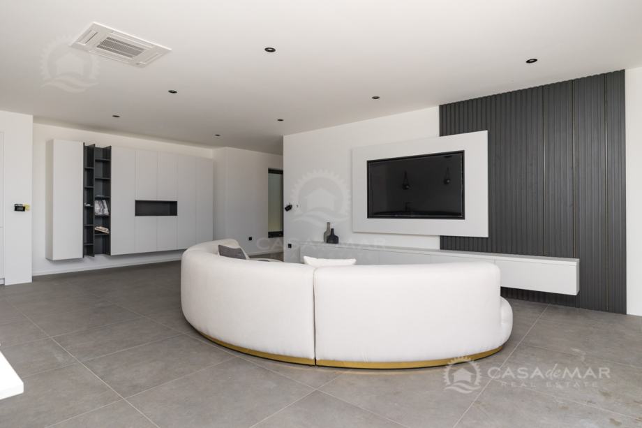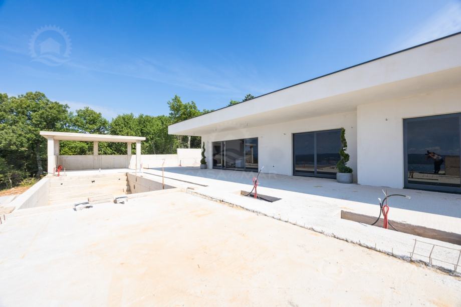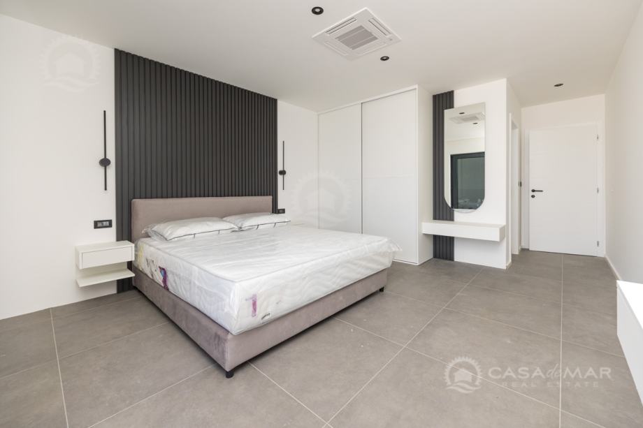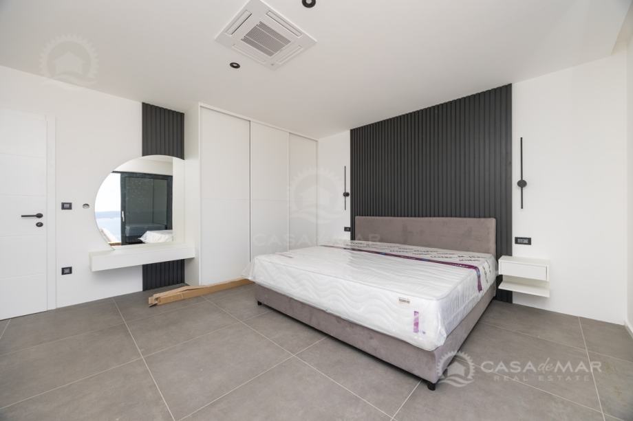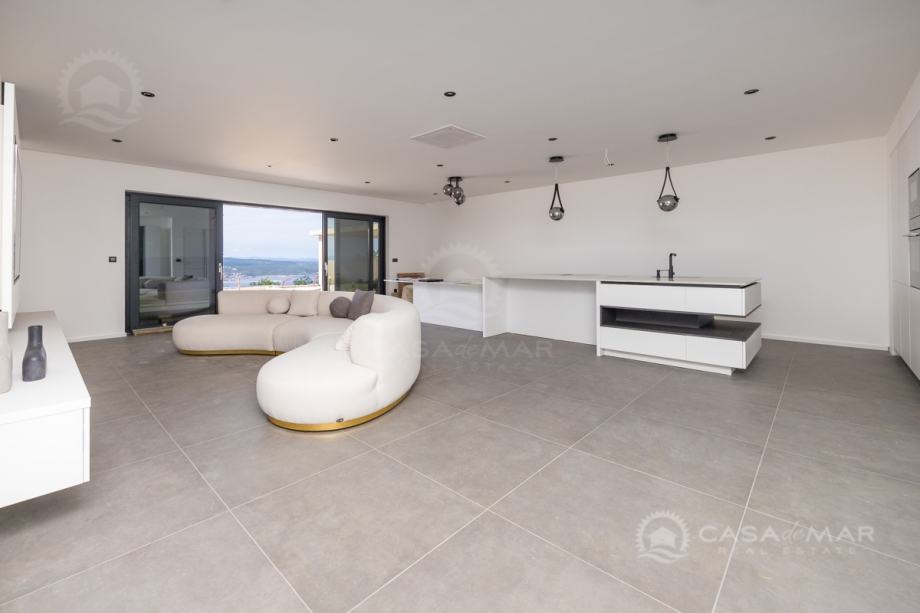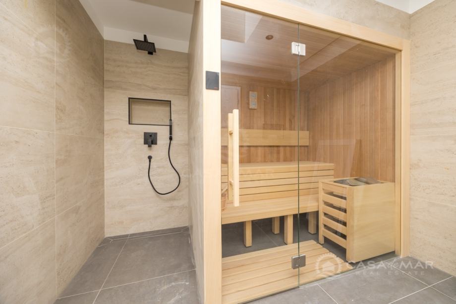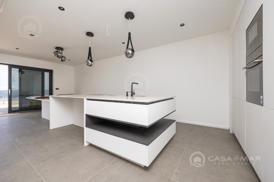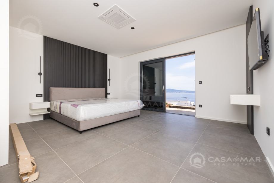 Vila površine 185,64 m² prostire se u potpunosti na jednoj etaži, što pruža izniman komfor i funkcionalnost te luksuz panoramskog pogleda na more iz svake sobe. Sastoji se od prostranog dnevnog boravka s kuhinjom i blagovaonicom u open-space konceptu, hodnika, vešeraja, gostinjskog toaleta, tri elegantne spavaće sobe – svaka s vlastitom kupaonicom, te saune za potpuni ugođaj relaksacije. Iz svih prostorija omogućen je direktan izlaz na savršeno uređenu okućnicu s jedinstvenim panoramskim pogledom na more koji ostavlja bez daha.