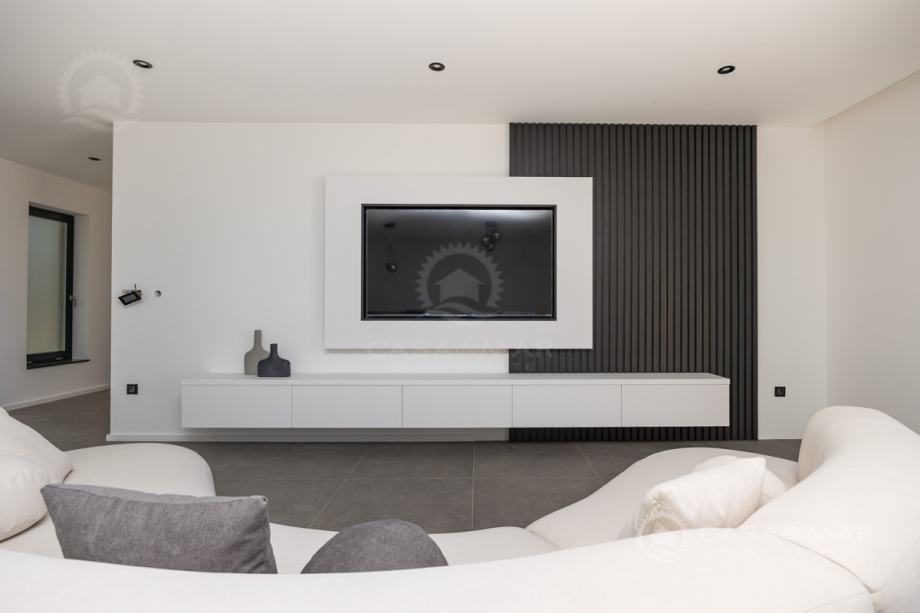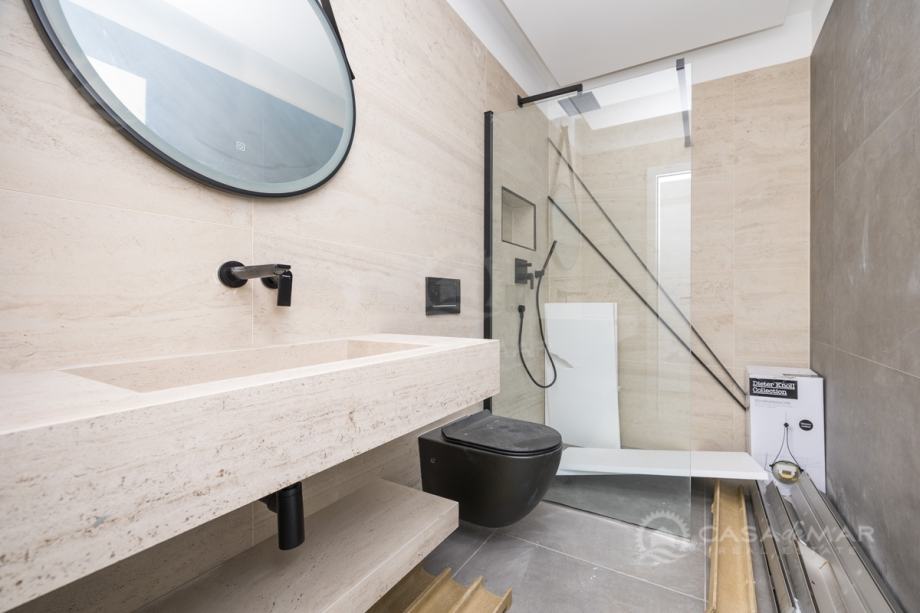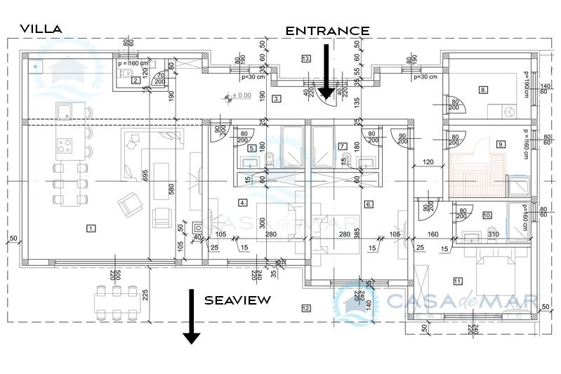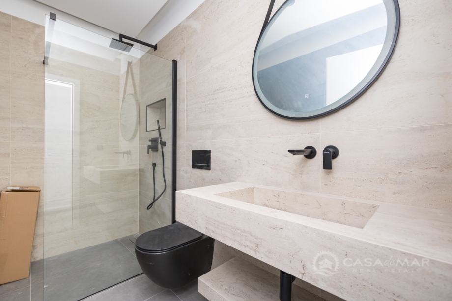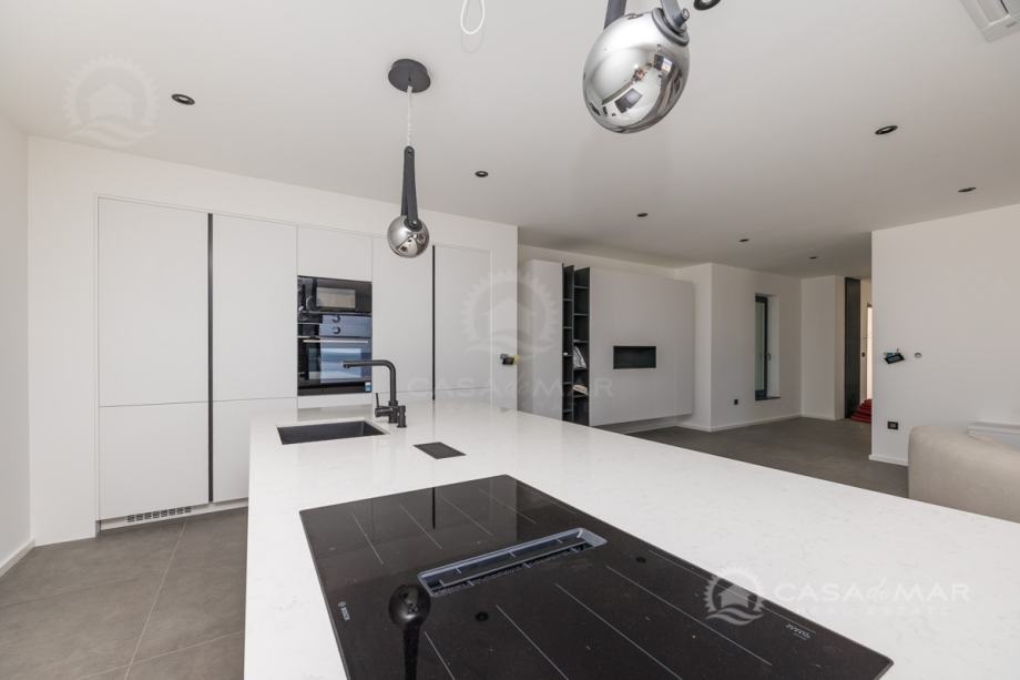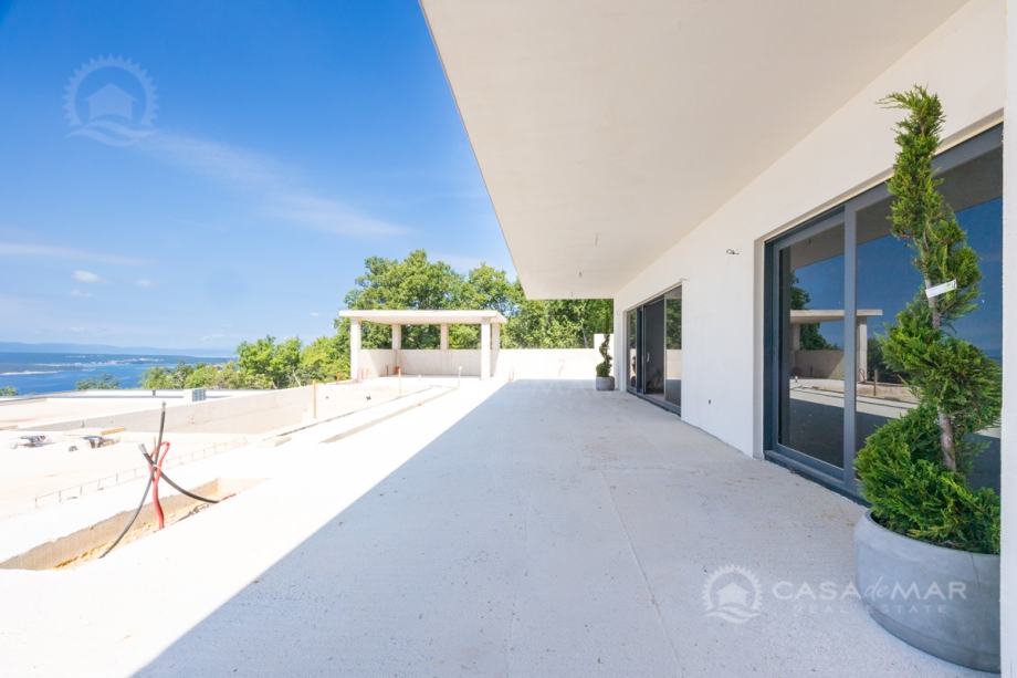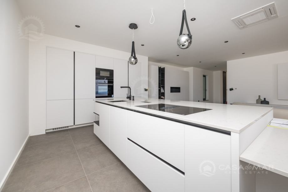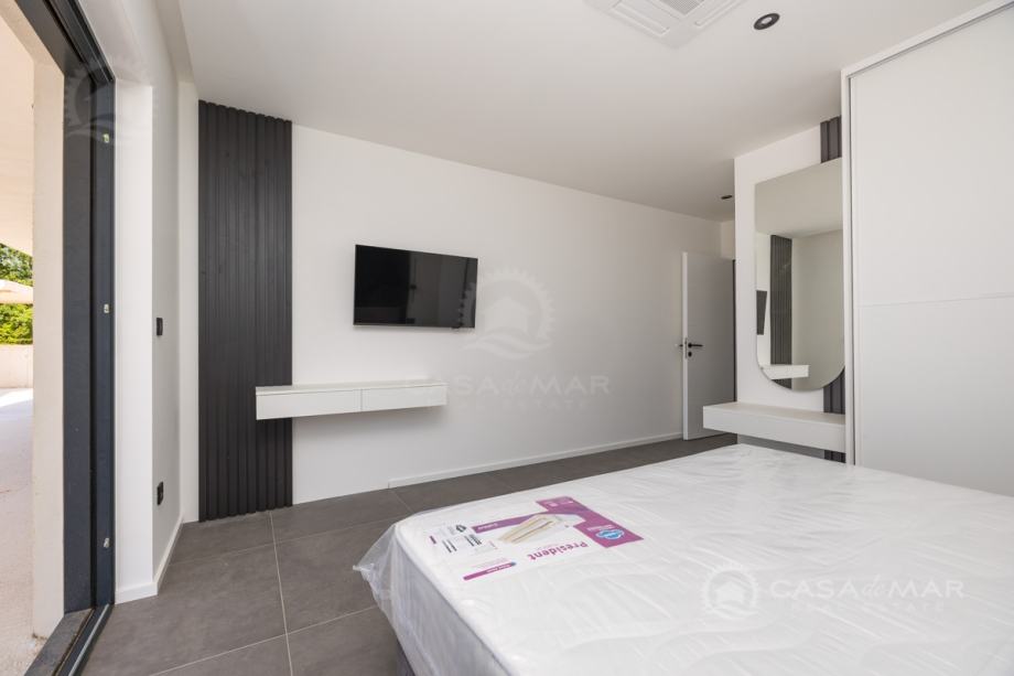 Vila površine 185,64 m² prostire se u potpunosti na jednoj etaži, što pruža izniman komfor i funkcionalnost te luksuz panoramskog pogleda na more iz svake sobe. Sastoji se od prostranog dnevnog boravka s kuhinjom i blagovaonicom u open-space konceptu, hodnika, vešeraja, gostinjskog toaleta, tri elegantne spavaće sobe – svaka s vlastitom kupaonicom, te saune za potpuni ugođaj relaksacije. Iz svih prostorija omogućen je direktan izlaz na savršeno uređenu okućnicu s jedinstvenim panoramskim pogledom na more koji ostavlja bez daha.