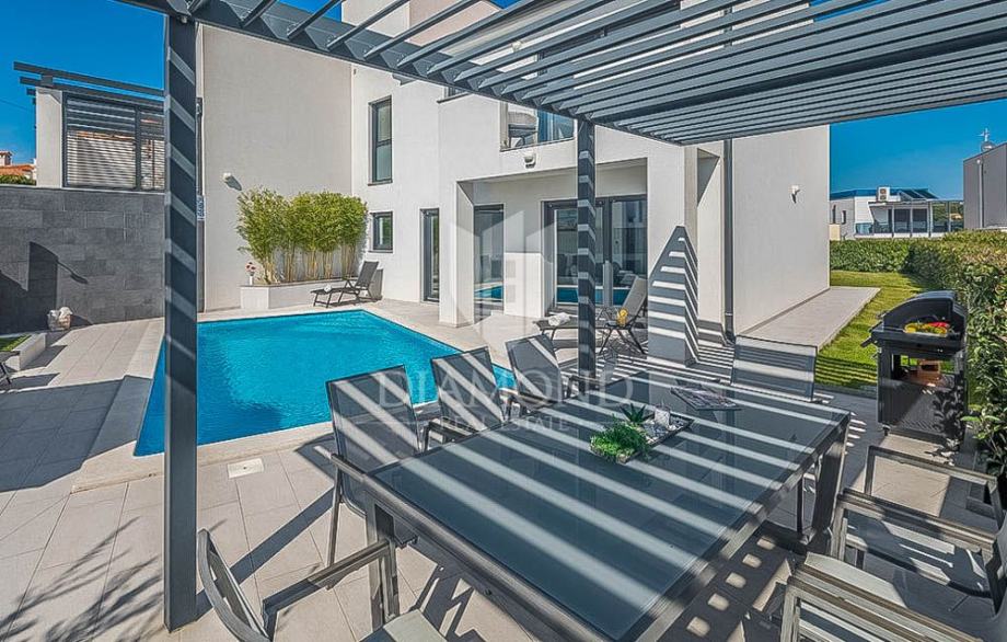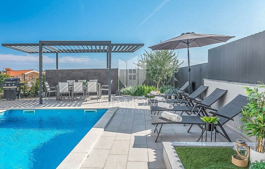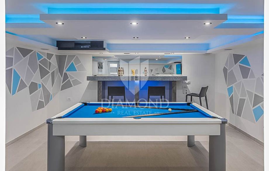 U prizemlju vile se nalazi kupaonica, kuhinja i dnevni boravak koji vodi na terasu. Na terasi se nalazi bazen 28m2 sa sunčalištem i ljetnom kuhinjom, stvoreno za opuštanje u pogledu. Na prvom katu se nalaze 4 spavaće sobe i 3 kupaonice, od kojih jedna ima i izlaz na balkon. U podrumu se nalazi prostor za zabavu opremljen zvučnicima, biljarom, pikadom, stolnim nogometom i video igricama. Na okućnici se nalazi i dječje igralište.
