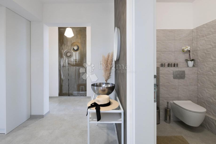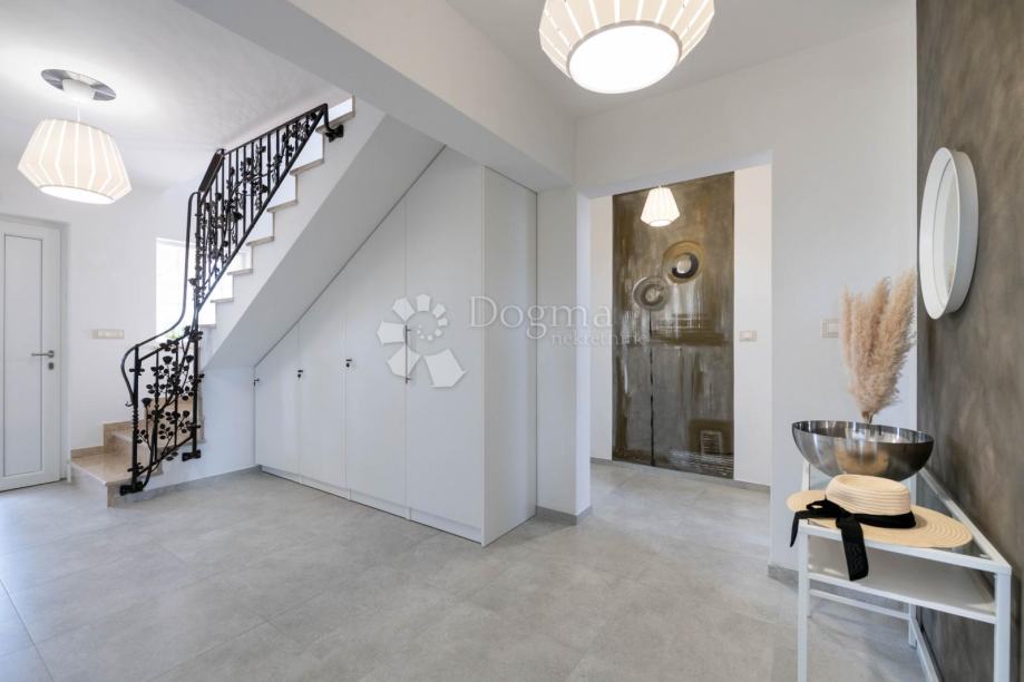 Visoko prizemlje kuće može se pohvaliti otvorenim konceptom dnevnog boravka, kuhinje i blagovaonice. Dnevni boravak i kuhinja izlaze na vlastite terase - kuhinjska terasa vodi do bazena 8x4 i sunčališta površine 100m2, popločeno kamenom, dok terasa dnevnog boravka ujedno je i ulaz u kuću.