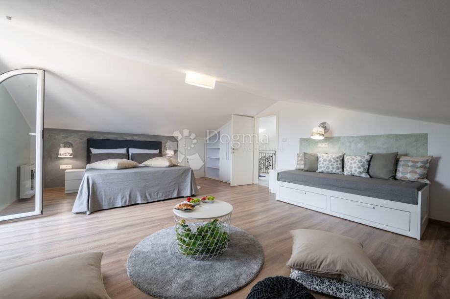 Kat kuće sadržava veliku spavaću sobu s pripadajućom kupaonicom, pružajući dodatnu razinu privatnosti.
