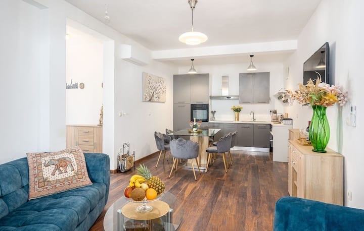 We mediate in the rental of four bedroom apartment in villa located in Strožanac, in Podstrana. It has a beautiful open panoramic view. The villa has 340m2 and consists of a ground floor and two floors, apartment that is renting has 110m2, 4 bedrooms, two bathrooms, a beautiful yard with a swimming pool, a grill and a terrace with deckchairs for outdoor enjoyment.