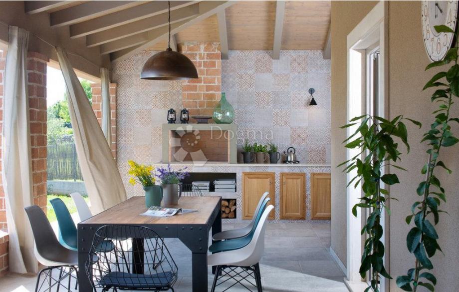 U prijelazu između unutarnjeg i vanjskog prostora smještena je natkrivena terasa s velikim kaminom – savršeno mjesto za pripremu jela s roštilja i uživanje na otvorenom. Vila je okružena zelenilom, pružajući osjećaj potpune povezanosti s prirodom i mira.