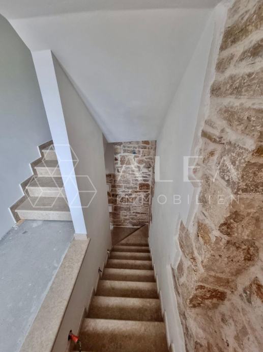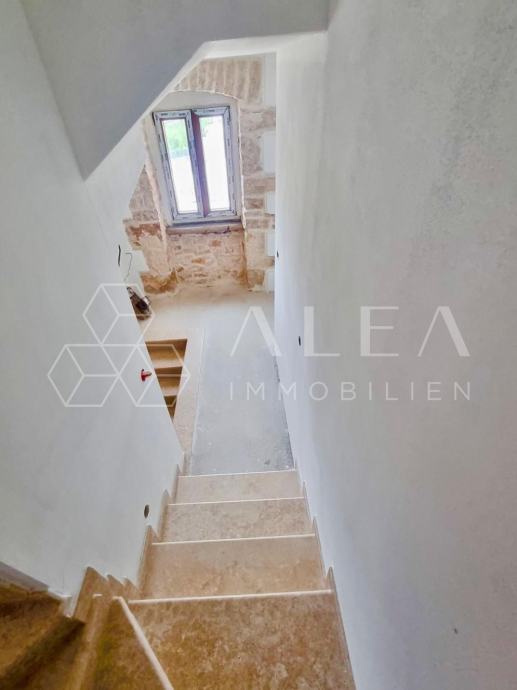Sastoji se od glavne kuće i pomoćnog objekta u dvorištu površine 684m2 omeđenom zidovima koji pružaju potpunu privatnost.