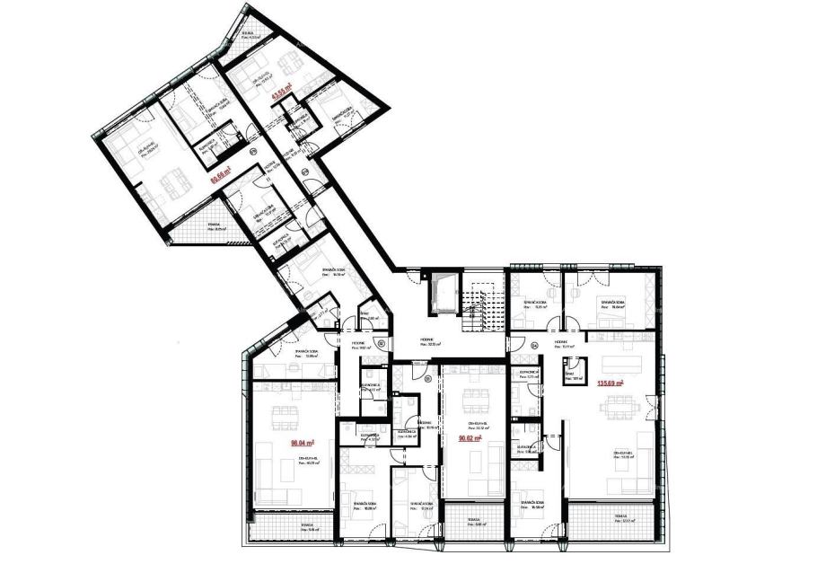 Stan S6, površine 98,05 m2, nalazi se na 2. katu i sastoji se od hodnika, 2 spavaće sobe, 2 kupatila, ostave, dnevnog boravka sa kuhinjom i blagovaonom i terase.