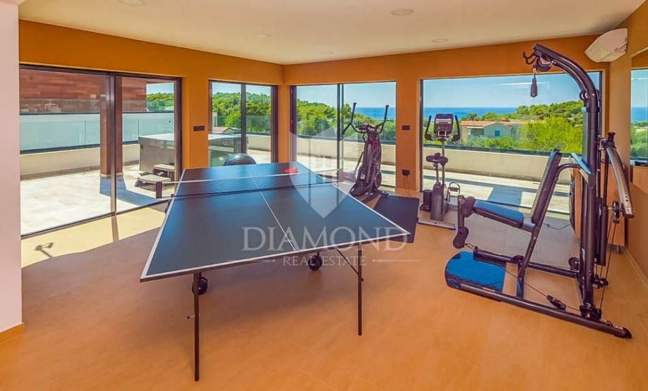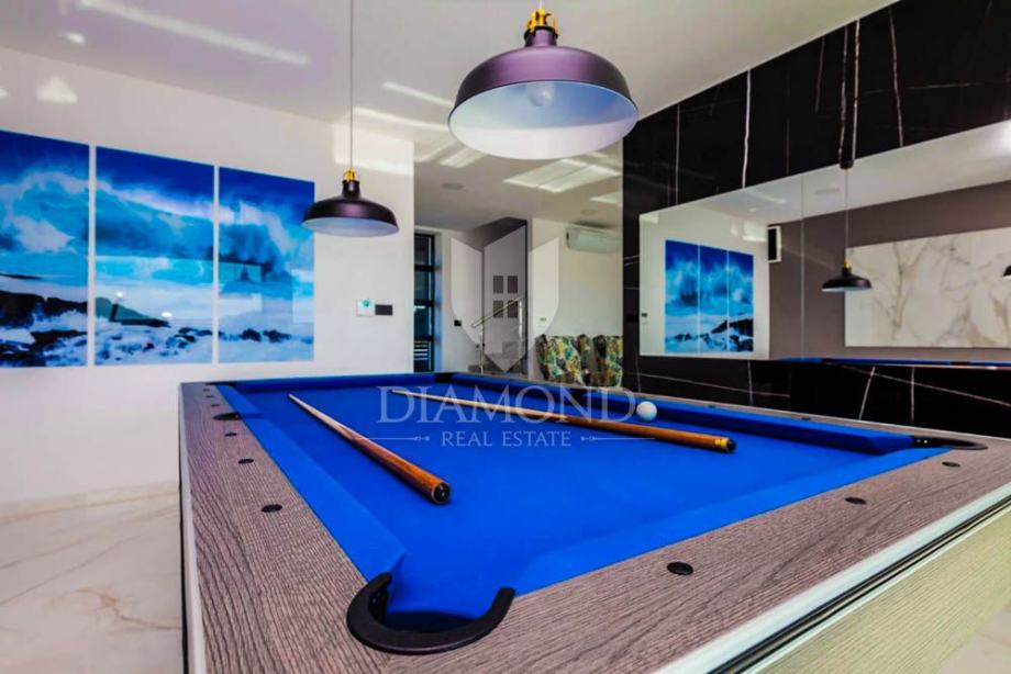 Stambena površina vile je 480m2. U prizemlju se nalazi prostrani dnevni boravak, moderna kuhinja, blagovaonica, sala za biljar te gostinjski wc. Na prvom katu se nalaze 4 spavaće sobe, svaka sa svojom kupaonicom te prekrasnim pogledom na more iz svakog ugla. Na 2 katu se nalazi još jedna spavaća soba sa svojom kupaonicom. Tu se smjestila i teretana sa stolnim tenisom, a na terasi se nalazi velika sauna i jaccuzzi iz kojeg se uživa u jedinstvenom pogledu na otvoreno more.