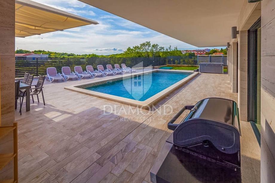 Prostrani vanjski prostor sadrži bazen od 40m2, veliki stol za blagovanje, vanjski roštilj te još jedan jacuzzi. Na okućnici se također nalazi i parkiralište.