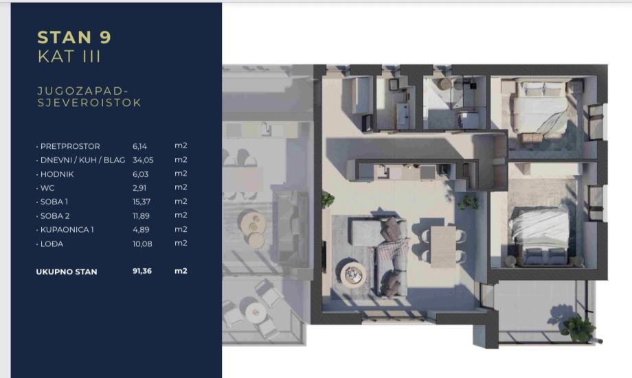 Stan posjeduje 2 prostrane spavaće sobe, kupatilo i odvojeni WC…