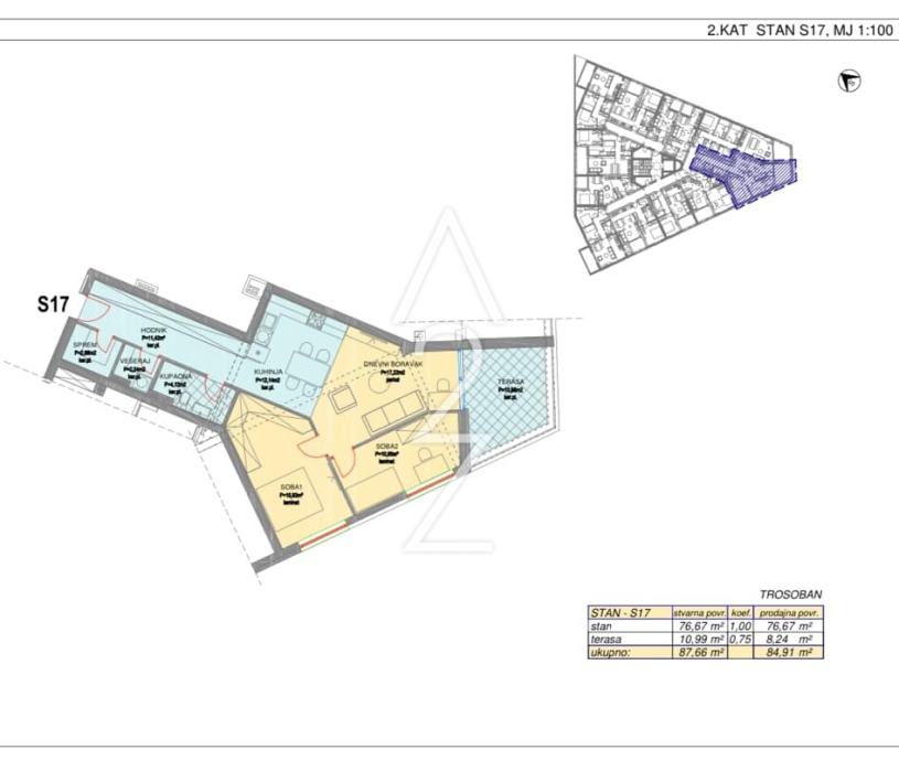 Prodaje se stan S17 na drugom katu koji je trosoban stan neto stambene kvadrature 84,91 m2, a sastoji se od hodnika, spremišta, open space koncepta boravka, kuhinje i blagovaonice s izlazom na terasu i otvorenim pogledom prema Čakovcu, dvije spavaće sobe, vešeraja i kupaonice. Dodatno se kupuje spremište i vanjsko ili garažno parkirno mjesto - prema odabiru kupca.