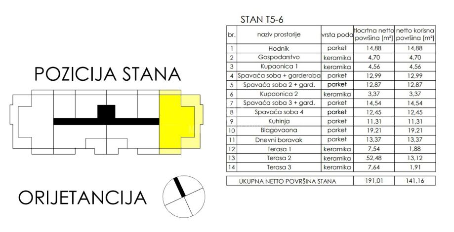 5 soban penthouse 141,16 m2 na 5. katu stambene nekretnine, lift, vrhunski materijali, parking u podzemnoj garaži.