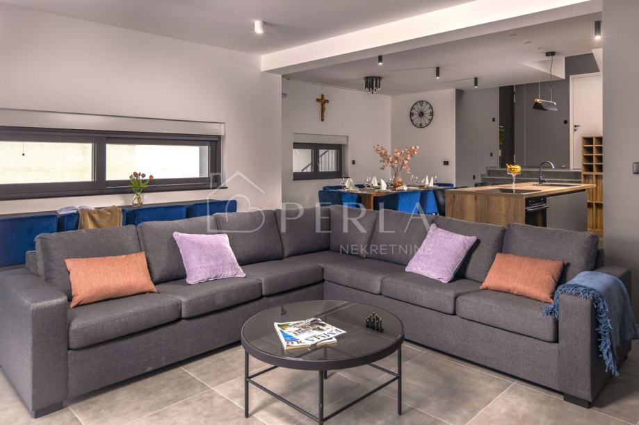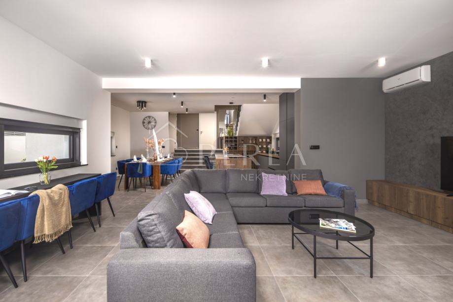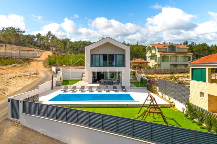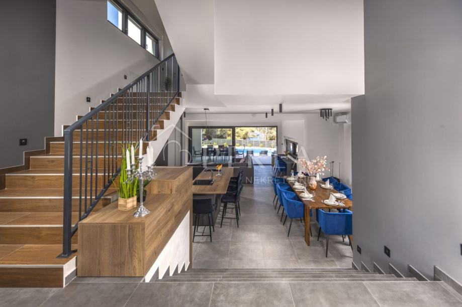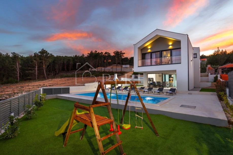 Prizemlje kuće je prava oaza za obiteljska okupljanja i zabavu jer se ispred nalazi komin, bazen od 36 m2 sa uređenim sunčalištem te uređeno dječje igralište.