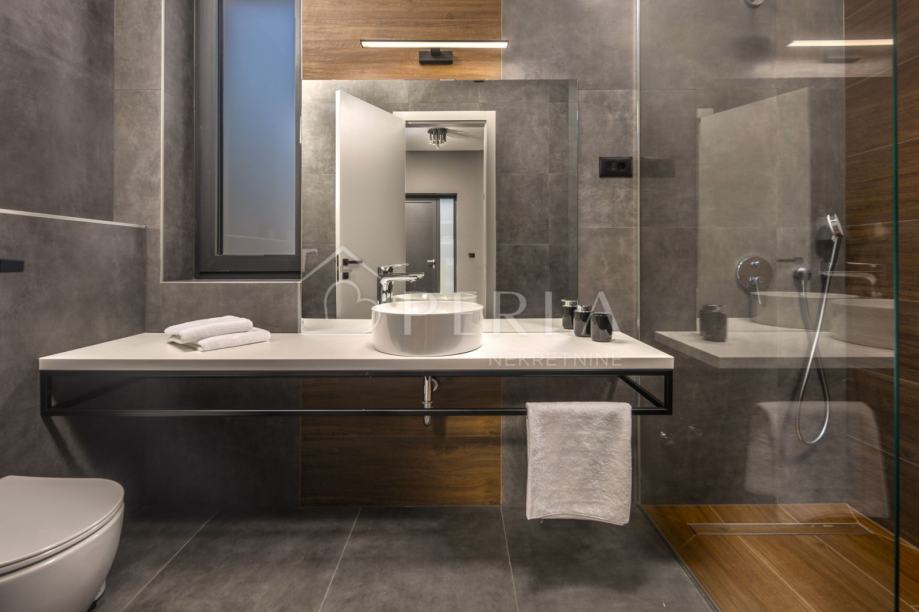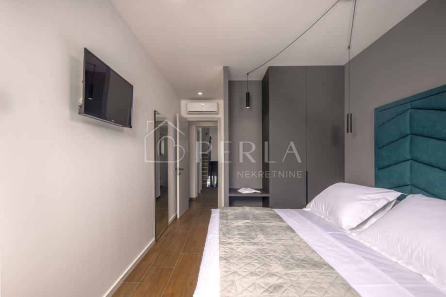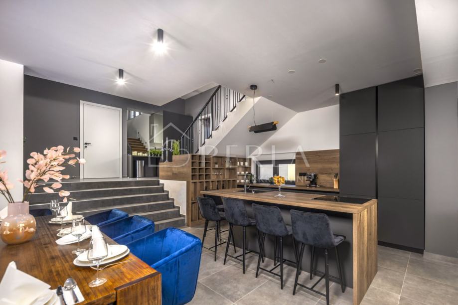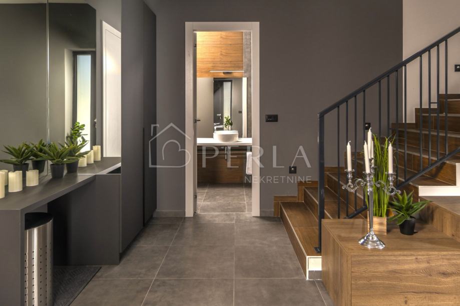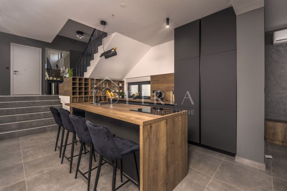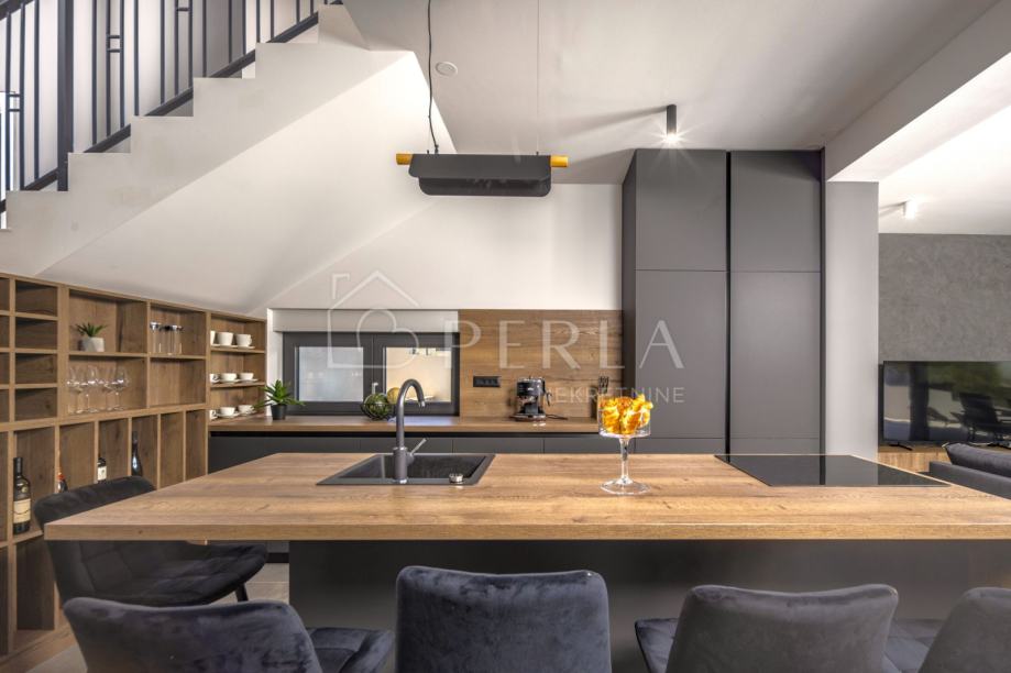 Elegantne stepenice vode na kat gdje se nalaze četiri prostrane spavaće sobe, svaka sa svojim kupaonicom, sauna i lođa.