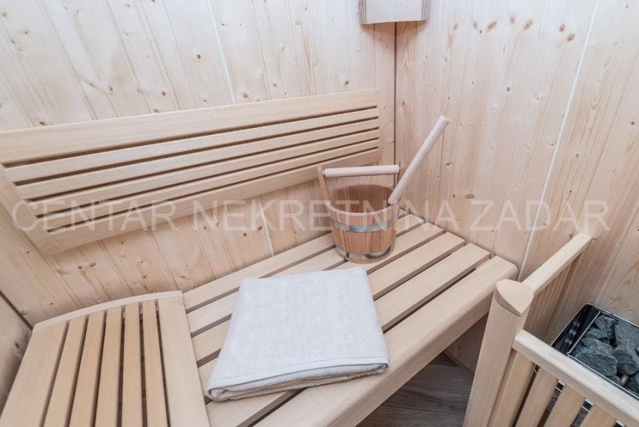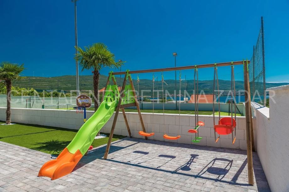 Prizemlje ima direktan pristup terasi i vrtu. Uz kuću je grijani bazen od 40 m² s popločanim sunčalištem, a dalje se nastavlja osvijetljeni teniski teren koji se može pretvoriti u teren za nogomet. U vrtu je i dječje igralište. Na vanjskoj terasi su zidani komin i opremljena ljetna kuhinja te prostor za druženje s kojeg se pruža predivan pogled na more.
