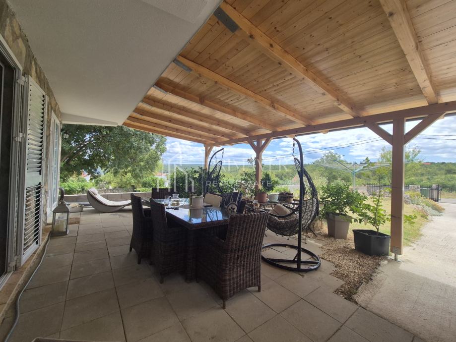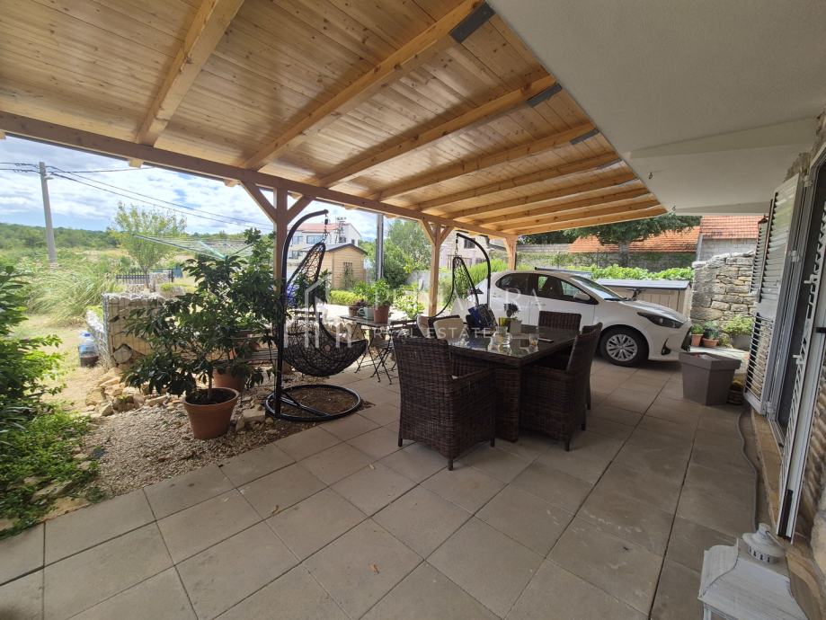 Prodaje se samostojeća kuća prizemnica u Pridrazi. Kuća je površine 117 m2, a sastoji se od tri prostrane spavaće sobe, kuhinje s blagovaonicom i dnevnim boravkom te dvije kupaonice s toaletom. Ispred ulaza nalazi se terasa natkrivena pergolom. Izgrađena je na zemljištu površine 389 m2. Obložena je benkovačkim kamenom, a na okućnici je zasađena trava i mediteransko bilje za koje je osigurano automatsko navodnjavanje. Dostupno je nekoliko parkirnih mjesta. U dvorištu je smještena i vrtna kućica za alat. Sa posjeda se pruža i pogled na more.