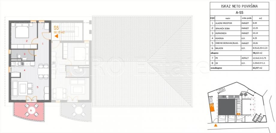 PROSTORIJE APARTMANA A-S5: vidjeti priloženi tlocrt