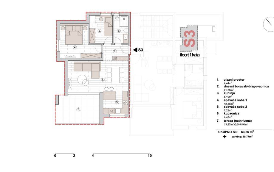 Ukupna zatvorena površina iznosi 63,56 m², a terasa dodatno proširuje životni prostor.
