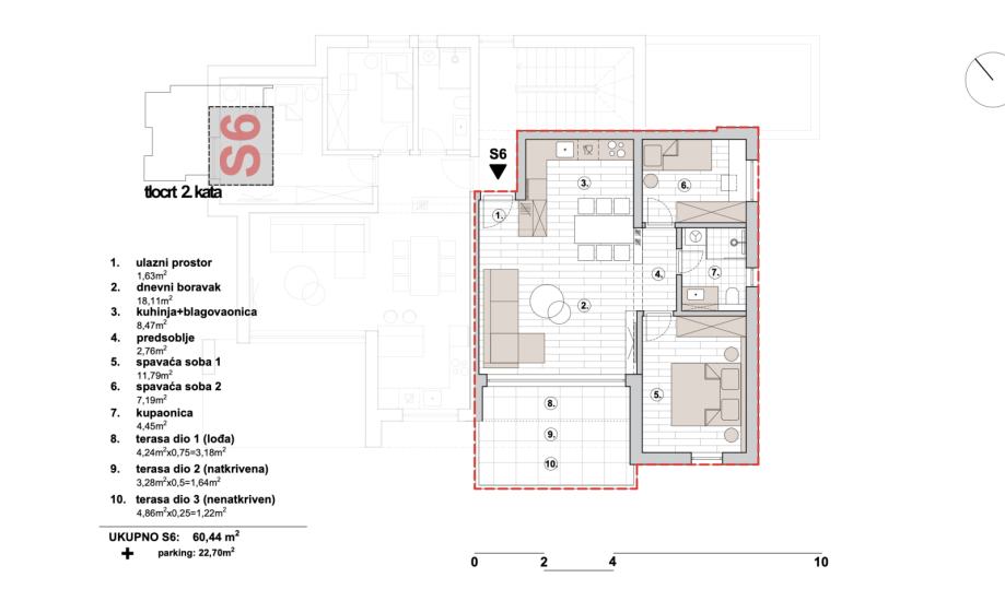 U ponudi je dvosoban stan (S6) veličine 71.79 m2 smješten na drugom katu suvremene stambene zgrade u izgradnji, na mirnoj lokaciji u Primoštenu. Zgrada se nalazi svega 1.500 metara od mora i samog centra mjesta. Projekt obuhvaća ukupno sedam moderno dizajniranih apartmana.