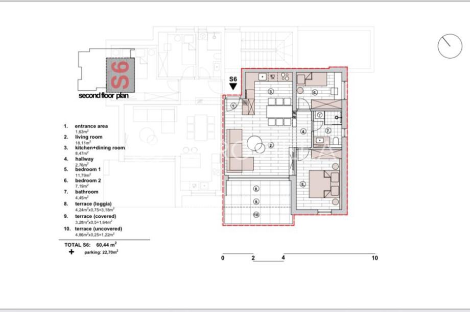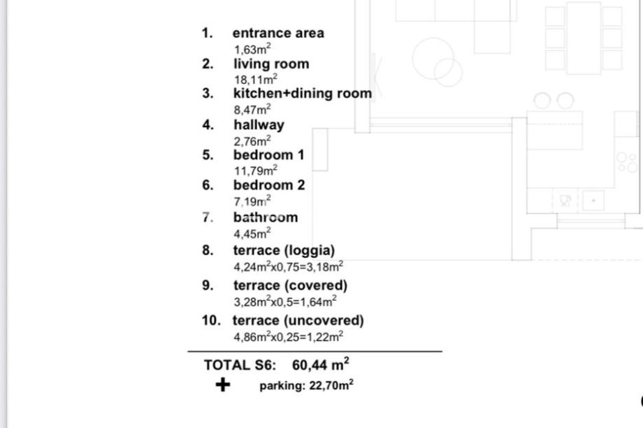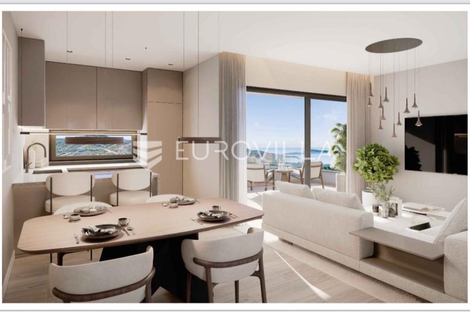 U Primoštenu na povišenoj poziciji, gradi se stambeni objekt južne orijentacije na pješačkoj udaljenosti od plaže od 1400 m. Objekt se sastoji od ukupno 7 luksuznih stambenih jedinica. Zahvaljujući izoliranoj i povišenoj poziciji, lokacija objekta pruža izuzetan mir i predivan pogled.Stan S6 na drugom katu jugoistočne orijentacije, ukupne neto korisne površine 71,79 m2 sastoji se od ulaznog prostora, prostranog dnevnog prostora (dnevni boravak, kuhinja i blagovaonica), dvije spavaće sobe površine 7 m2 odnosno 12 m2, kupaonice i terase površine 8 m2. Površina zatvorenog prostora iznosi 54,4 m2.Stanu još dodatno pripada parking mjesto površine 22,7 m2.U izgradnji objekta se koriste vrhunski materijali i primjenjuju visoki standardi gradnje. Objekt se gradi armiranobetonskom konstrukcijom, s fasadom od kamene vune debljine 10 cm. Vanjska aluminijska stolarija opremljena je troslojnim staklom, električnim roletama i komarnicima na sobnim prozorima.Stanovi imaju protuprovalna vrata, klima uređaj u svakoj prostoriji, podno grijanje, dok su podne obloge keramika i parket vrhunske kvalitete, dostupne u više varijanti prema izboru kupca.Parkirna mjesta osigurana su u garaži i na otvorenom i svako parking mjesto će imati punionicu za struju.Objekt je trenutačno u izgradnji, u tijeku su konstrukcijski radovi. Predviđeni završetak konstrukcijskih radova je početkom 2026 godine a očekivano useljenje je krajem 2026 godine pa se kupcu pruža mogućnost da po individualnim dizajnerskim rješenjima i u dogovoru s investitorom osmisli detalje u završnom uređenju unutrašnjosti pojedinog stana.Način plaćanja: 30 % prilikom potpisa predugovora / 30 % nakon završetka konstrukcijskih radova / 30% nakon završetka objekta / 10 % nakon ishođenja uporabne dozvole.Malo o mjestu: Primošten je predivan mali gradić smješten na obali jadranskog mora između Šibenika I Trogira s razlogom proglašen najboljom turističkom destinacijom 2024 godine. Prvi spomen mjesta Primošten potječe od 1564 godine. Poznat po svojoj izuzetnoj ljepoti i šarmu, posjetitelje širom svijeta privlači slikovitim krajolikom i bogatom poviješću.Jedno od najpoznatijih obilježja Primoštena je njegova starogradska jezgra uz koju se proteže poluotok.Geografski položaj Primoštena i prirodne osobine njegovog obalnog pojasa nose značajne vrijednosti. Uvale Velika i Mala Raduča, a naročito uvala Primošten (luka) ističu se izvanrednim prirodnim ljepotama.Dodatne informacije - udaljenosti od važnijih lokacija:Plaža: 1400 m / Primošten centar: 1500 m / Trogir: 30 km / zračna luka: 35 kmKupovina: 400 m / restoran: 1500 m / ljekarna: 400 m / banka: 1500 m / škola: 500 mZa sva dodatna pitanja stojim na raspolaganju....Za ovu nekretninu kontaktirajte agenta na broj telefona +385 99 400 6073.Više na Eurovilla.hr, ID: 381952Direktan link: https://eurovilla.hr/nekretnina/primosten-dvosobni-stan-na-2-katu-novogradnje-s-pogledom-na-more/381952/-----... For this property contact our agent on telephone number +385 99 400 6073.More on Eurovilla.hr, ID: 381952Direct link: https://eurovilla.hr/en/property/primosten-two-bedroom-apartment-on-the-2nd-floor-of-a-new-building-with-a-sea-view/381952/...