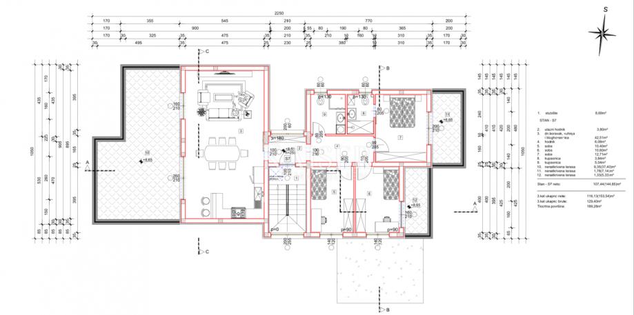 Ovaj jedinstveni stan na trećem, zadnjem katu, pruža apsolutnu privatnost, obilje sunčeve svjetlosti i prostrane terase stvorene za uživanje. S ukupnom neto površinom od 107,44 m², nudi beskompromisan luksuz i komfor.