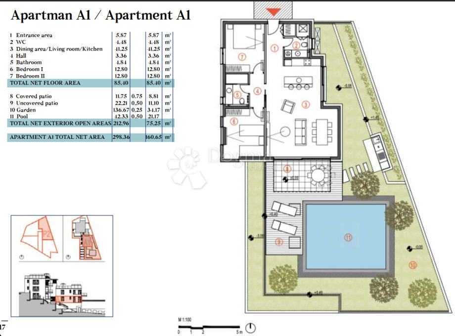 • Vanjski prostor: 212,96 m² (obračunski 75,25 m²) – prostrana terasa, sun deck, vrt i privatni bazen od 42,3 m²