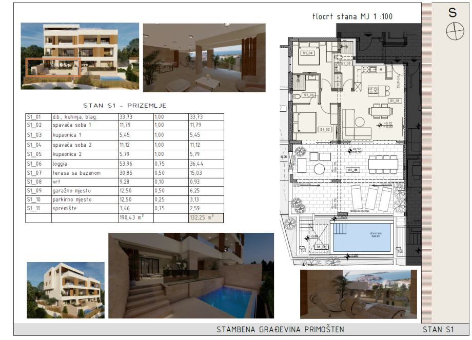 Stan se nalazi u prizemlju zgrade te se ističe svojim modernim dizajnom i impresivnim sadržajima. Na brutto površini od 186m2 i netto površini od 128m2, pruža vam prostranost i funkcionalnost.