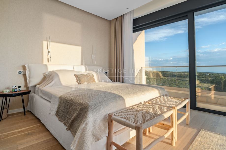 Raspored vile uključuje više razina za maksimalnu praktičnost i luksuz. Garažna etaža ima ulaz s parkingom za jedan automobil, dva dodatna parkirna mjesta unutar ograđenog posjeda i spremište. Na prvom katu nalazi se otvorena kuhinja i dnevni boravak, jedna spavaća soba s vlastitom kupaonicom i gostinjski WC. Prostrana terasa na ovom katu uključuje L-oblikovani infinity bazen, koktel bar i kamin. Na drugom katu nalaze se četiri spavaće sobe s vlastitom kupaonicom, a dvije glavne spavaće sobe imaju terase s pogledom na more i unaprijed instalirane priključke za jacuzzi.