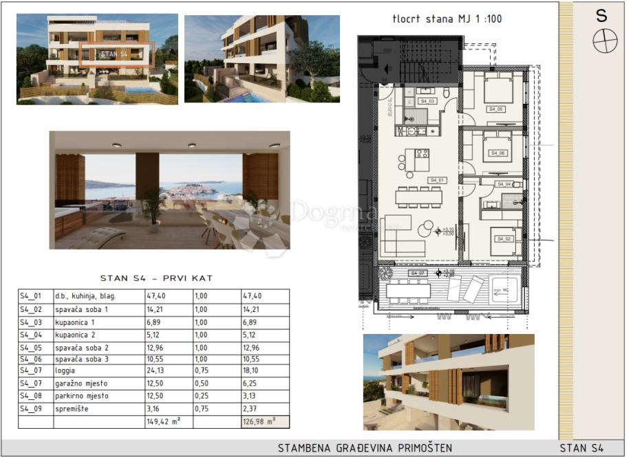 Stan S4 na prvom katu se sastoji od open space dnevnog dijela s kuhinjom i blagavaonicom, 2 spavaće sobe, 2 kupaonice, prostrane loggie s jacuzzijem, ukupne stambene površine 115.23m2.