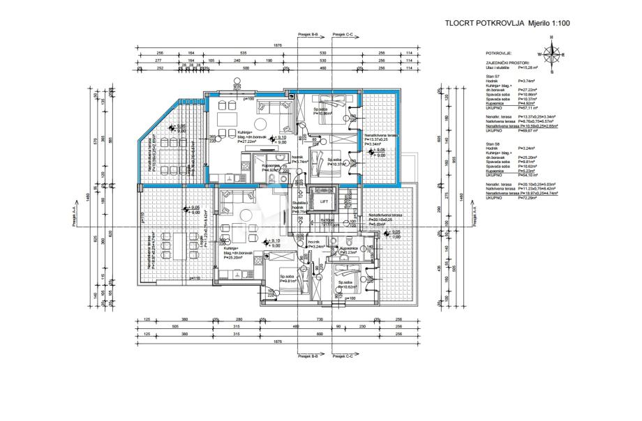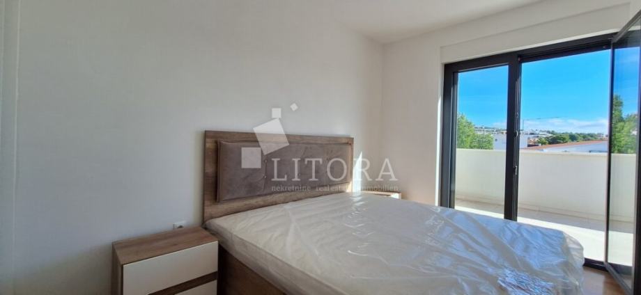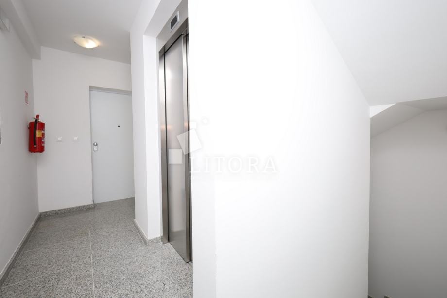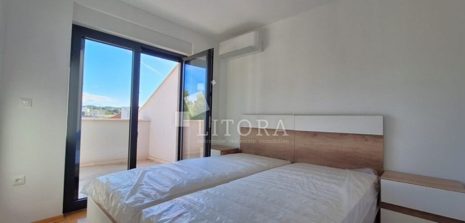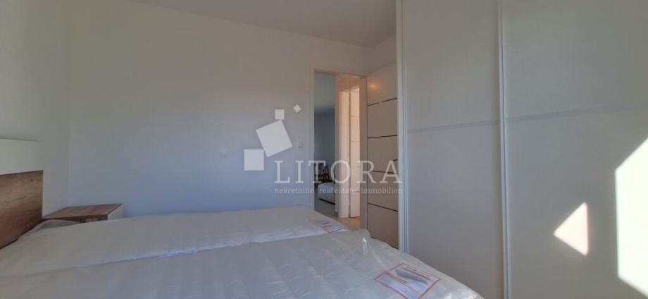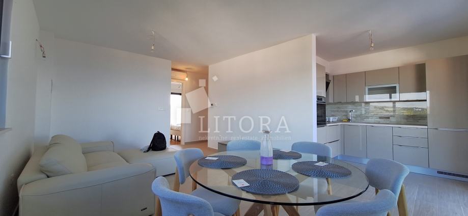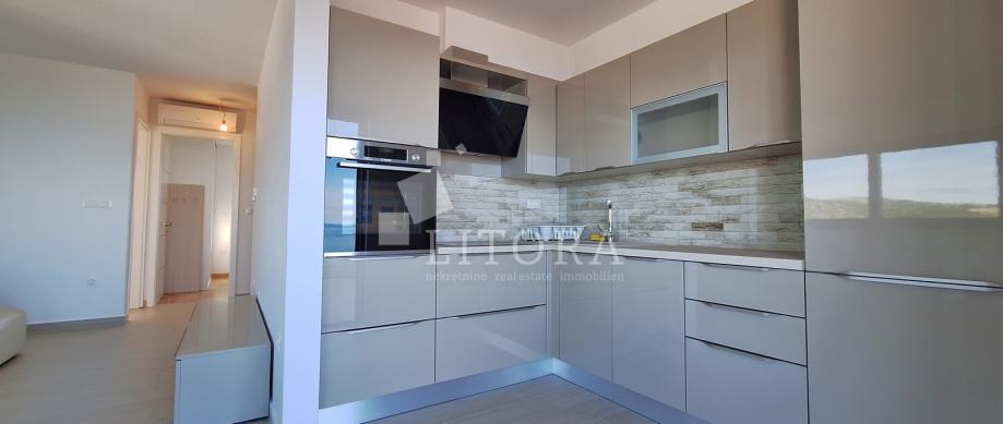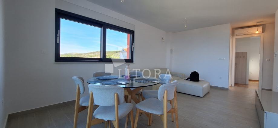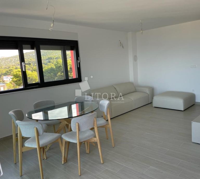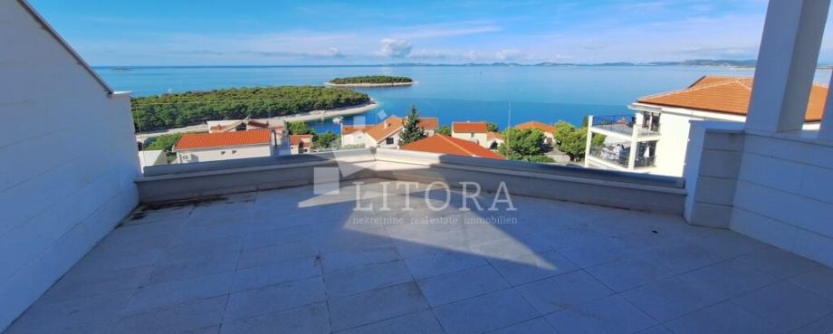 Primošten, mirno okruženje – dvosobni namješteni apartman na 3. katu (zadnjoj etaži) s velikom terasom i panoramskim pogledom na more. Apartman je orijentiran na jugozapadnu stranu, ima 89,78 m² korisne površine, a sastoji se od predsoblja / hodnika, kupaonice, kuhinje s blagovaonicom i dnevnog boravka s izlazom na prostranu terasu površine 19,35 m². Dvije spavaće sobe također imaju izlaz na drugu terasu od 13,37 m². Apartmanu pripada jedno garažno parkirno mjesto površine 17,01 m² te ostava/spremište od 8,20 m². U potpunosti je namješten, a namještaj je uključen u cijenu nekretnine. Opremljen je kvalitetnom vanjskom stolarijom s roletama i komarnicima, protuprovalnim vratima, modernim sanitarijama, inverter klima-uređajima za grijanje i hlađenje u svakoj prostoriji te kvalitetnom unutarnjom stolarijom. Zgrada je opremljena liftom. Udaljenost do centra mjesta iznosi 750 m, a do plaže 530 m.