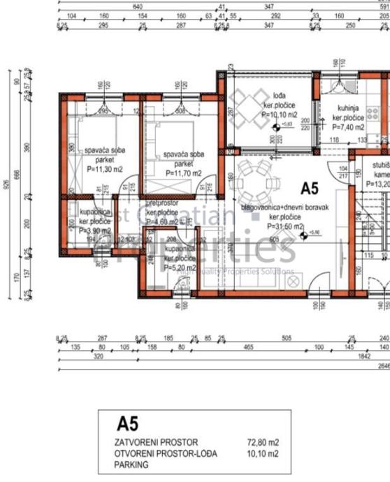 Predmetni stan se sastoji od predprostora (4.60m2), dnevnog boravka s blagovaonicom (31,50 m2), kuhinje (7,40 m2) , spavaće sobe 1 (11,70 m2), spavaće sobe 2 (11.30 m2), kupaonice 1 (3,90 m2), kupaonice 2 (5.20 m2) te loggie (10,10 m2).