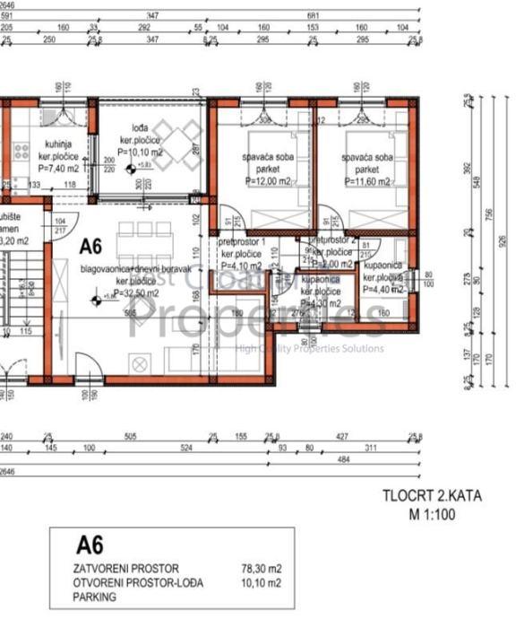 Predmetni stan se sastoji od predprostora 1 (4.10m2) , predprostora 2 (2,00 m2), dnevnog boravka s blagovaonicom (32,50 m2), kuhinje(7,40 m2) , spavaće sobe 1 (12,00 m2), spavaće sobe 2 (11.60 m2), kupaonice 1 (4,40 m2), kupaonice 2 (4.30 m2) te loggie (10,10 m2).