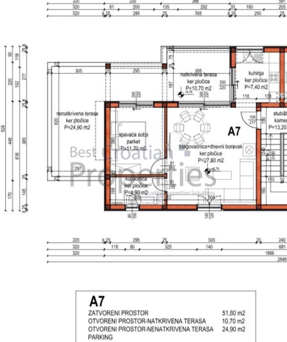Ukupna prodajna površina sa 1 parkirnim mjestom (13.25m2) sa koeficijentom ispada= 68.82 m2.
