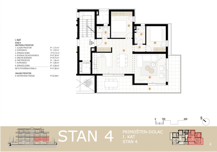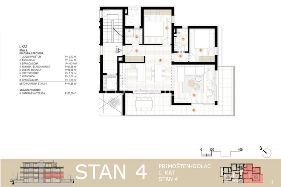 Moderan stan na prvom katu s pogledom na more, smješten u drugom redu do mora, ukupne neto korisne površine 86,63 m². Stanu pripada jedno parkirno mjesto, a zatvoreni stambeni prostor iznosi 71,88 m². Zgrada je opremljena dizalom, što osigurava lagan pristup stanu.Stan se sastoji od dnevnog boravka s kuhinjom i blagovaonicom, dvije spavaće sobe - od kojih jedna ima privatnu kupaonicu - te dodatne kupaonice. Iz dnevnog boravka izlazi se na terasu od 23,36 m² s prekrasnim pogledom na more.Stan se prodaje nenamješten, spreman za personalizaciju prema ukusu budućeg vlasnika.Lokacija je jedna od najvećih prednosti ove nekretnine - more je udaljeno svega 50 metara, a zahvaljujući konfiguraciji terena i prostornoj situaciji, pogled na more je trajan i nije ga moguće zagraditi, što ovaj stan čini iznimno vrijednim i dugoročno atraktivnim.Zgrada je novogradnja visoke kvalitete, a stanovi su opremljeni:podnim grijanjem u kupaonicama i boravku,ALU stolarijom s IZO staklom,električnim roletama,protuprovalnim vratima,klimatizacijom u svakoj sobi.Ovaj stan predstavlja odličnu priliku za one koji žele komfornu, modernu i dugoročno sigurnu investiciju, bilo za život, odmor ili turistički najam.Za sve dodatne informacije i dogovor razgledavanja, stojimo na raspolaganju....Za ovu nekretninu kontaktirajte agenta na broj telefona +385 98 163 3268.Više na Eurovilla.hr, ID: 645604Direktan link: https://eurovilla.hr/nekretnina/primosten-novogradnja-stan-s-pogledom-na-more-drugi-red-do-mora-nkp-86-63-m2/645604/-----... For this property contact our agent on telephone number +385 98 163 3268.More on Eurovilla.hr, ID: 645604Direct link: https://eurovilla.hr/en/property/primosten-new-building-apartment-with-a-sea-view-second-row-to-the-sea-86-63-m2/645604/...