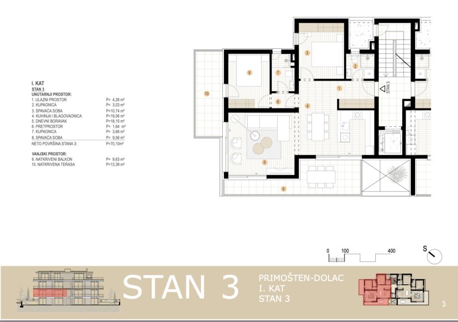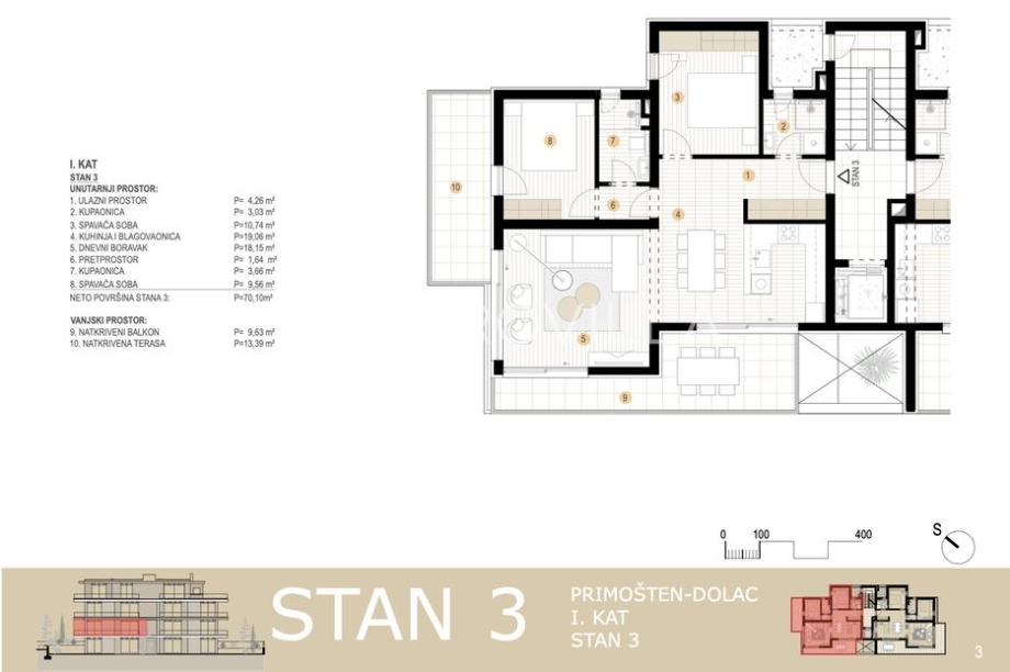 Moderan stan na prvom katu s pogledom na more, smješten u drugom redu do mora, ukupne neto korisne površine 84,74 m². Stanu pripada jedno parkirno mjesto, a zatvoreni stambeni prostor iznosi 70,10 m². Zgrada je opremljena dizalom, što osigurava lagan pristup stanu.Stan se sastoji od dnevnog boravka s kuhinjom i blagovaonicom, dvije spavaće sobe - od kojih jedna ima privatnu kupaonicu - te dodatne kupaonice. Iz dnevnog boravka izlazi se na terasu od 9,6 m² s prekrasnim pogledom na more, a iz spavaće sobe se izlazi na drugu terasu površine 13,39 m².Stan se prodaje nenamješten, spreman za personalizaciju prema ukusu budućeg vlasnika.Lokacija je jedna od najvećih prednosti ove nekretnine - more je udaljeno svega 50 metara, a zahvaljujući konfiguraciji terena i prostornoj situaciji, pogled na more je trajan i nije ga moguće zagraditi, što ovaj stan čini iznimno vrijednim i dugoročno atraktivnim.Zgrada je novogradnja visoke kvalitete, a stanovi su opremljeni:podnim grijanjem u kupaonicama i boravku,ALU stolarijom s IZO staklom,električnim roletama,protuprovalnim vratima,klimatizacijom u svakoj sobi.Ovaj stan predstavlja odličnu priliku za one koji žele komfornu, modernu i dugoročno sigurnu investiciju, bilo za život, odmor ili turistički najam.Za sve dodatne informacije i dogovor razgledavanja, stojimo na raspolaganju....Za ovu nekretninu kontaktirajte agenta na broj telefona +385 98 163 3268.Više na Eurovilla.hr, ID: 179968Direktan link: https://eurovilla.hr/nekretnina/primosten-novogradnja-stan-s-pogledom-na-more-drugi-red-do-mora-nkp-84-74-m2/179968/-----... For this property contact our agent on telephone number +385 98 163 3268.More on Eurovilla.hr, ID: 179968Direct link: https://eurovilla.hr/en/property/primosten-new-building-apartment-with-a-sea-view-second-row-to-the-sea-84-74-m2/179968/...