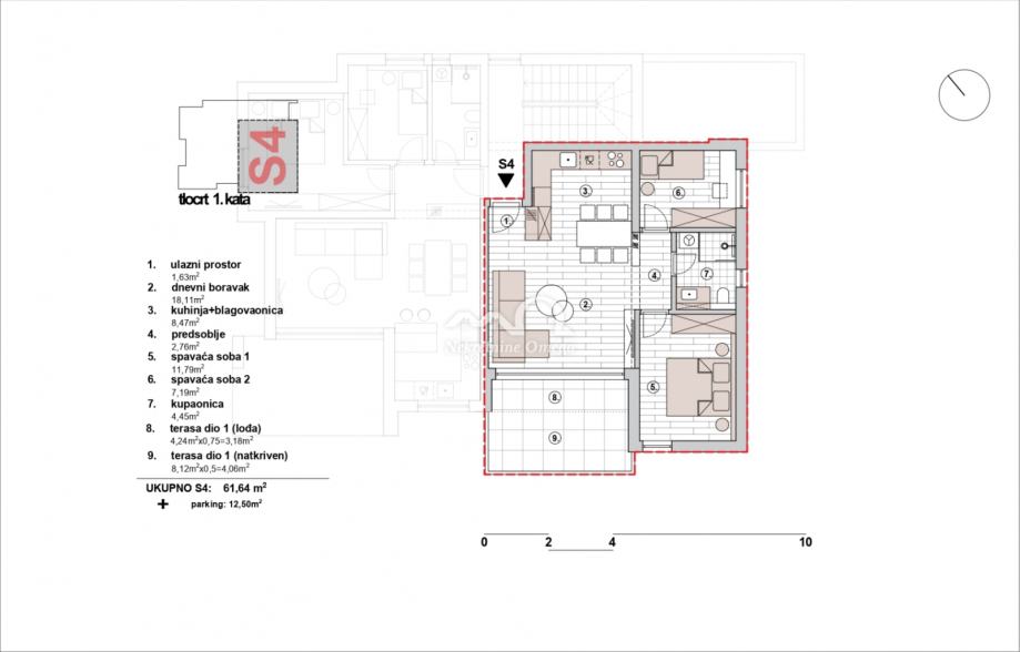 Na prodaju je dvosoban stan S4, smješten na prvom katu zgrade, južne orijentacije, ukupne površine 66,64 m².