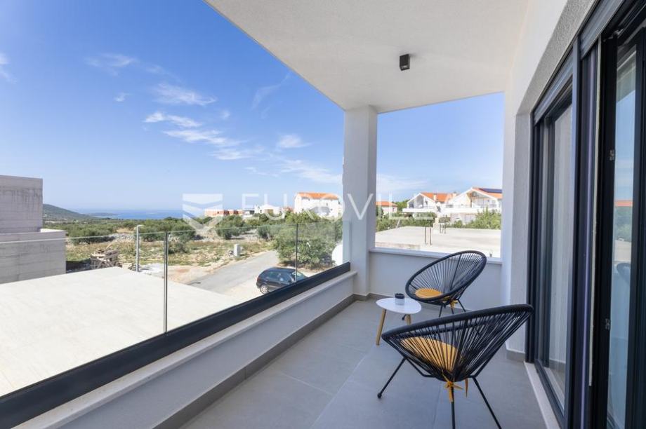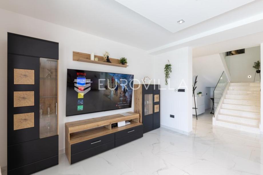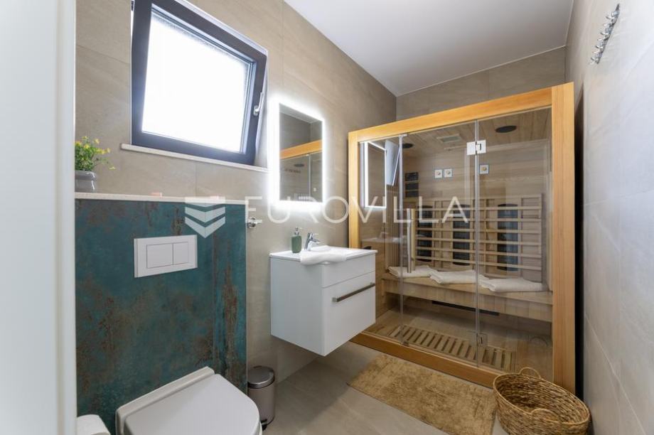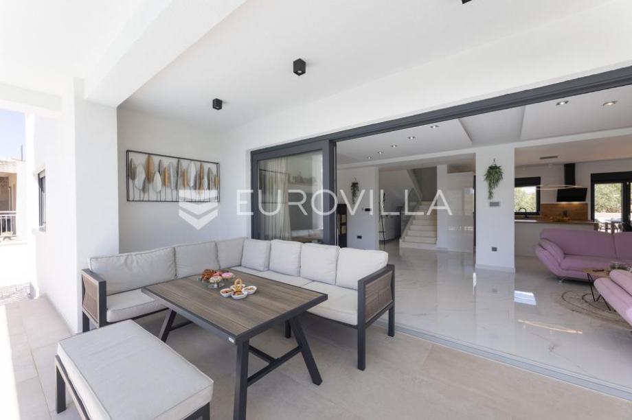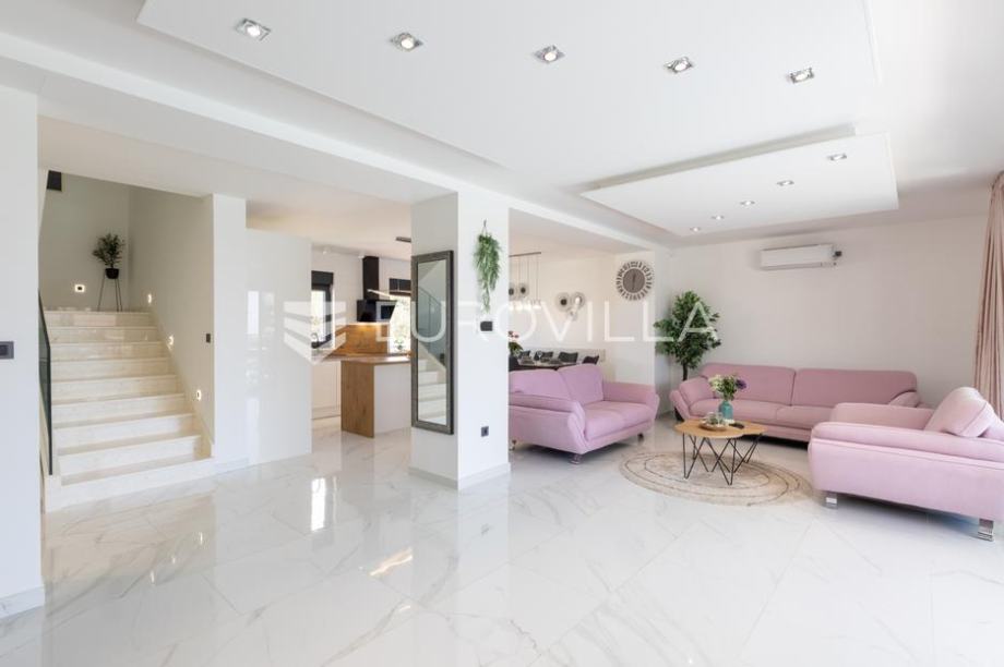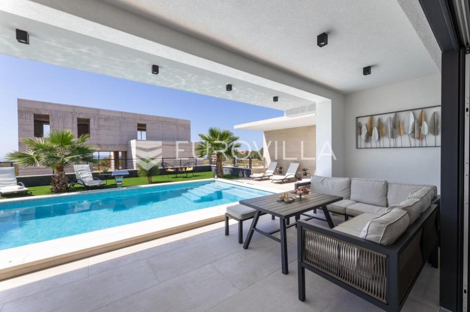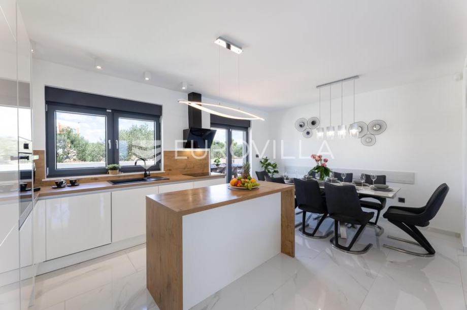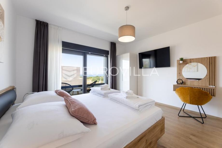 Primošten, moderna vila s bazenom i pogledom na more površine 311,56 m². Izgrađena je 2024. godine. Prodaje se potpuno namještena i opremljena, te idealna za odmor ili turistički najam.Izgrađena na 3 etaže na parceli od 515 m². Sastoji se od prizemlja u kojem se nalazi dnevni boravak s kuhinjom i blagovaonicom, jedna spavaća soba s privatnom kupaonicom, te još jedna prostorija s toaletom i saunom. Dnevni boravak se otvara na prostranu natkrivenu terasu pokraj bazena. Unutarnjim stepenicama dolazimo na kat gdje se nalaze još 4 spavaće sobe, od kojih dvije imaju privatne kupaonice, te još jedna dodatna kupaonica. Tri spavaće sobe imaju pripadajuće balkone. S bočne strane kuće nalaze se stepenice kojima se spušta u praktični podrum ispod kuće.Vila je odlično opremljena, te su korišteni samo premium aparati i vrhunski namještaj. Bazen je opremljen sustavom za protustrujno plivanje.Oko vile se prostire lijep vrt, te prostor za sunčanje. Pokraj vile nalaze se 4 parkirna mjesta. Sa stražnje strane nalazi se roštilj i prostor za druženje i objedovanje. Mikrolokacija vile je odlična, na jako mirnom mjestu, te je udaljenost od mora 2200 metara.Sve ostale informacije na upit....