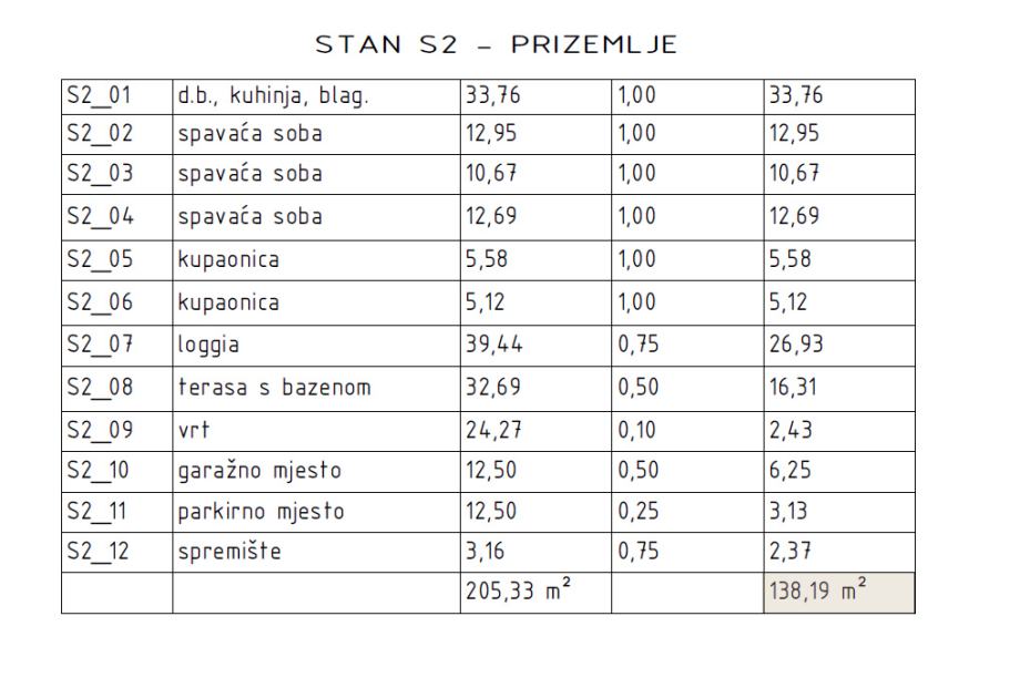 Stan se nalazi u prizemlju zgrade i ističe se svojim modernim dizajnom i impresivnim sadržajima. S brutto površinom od 205,33 m2 i netto površinom od 138,19 m2, nudi vam prostranost i funkcionalnost za svakodnevni život.
