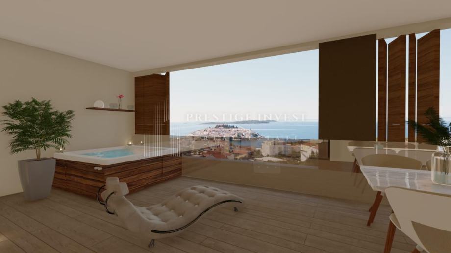 Ovaj prekrasan stan ima izlaz iz dnevnog boravka na prostranu terasu površine 32,69 m2 i vrt od 24,27 m2. Terasa je opremljena bazenom, vanjskim tušem i prostorom za opuštanje i sunčanje, pružajući savršeno mjesto za uživanje