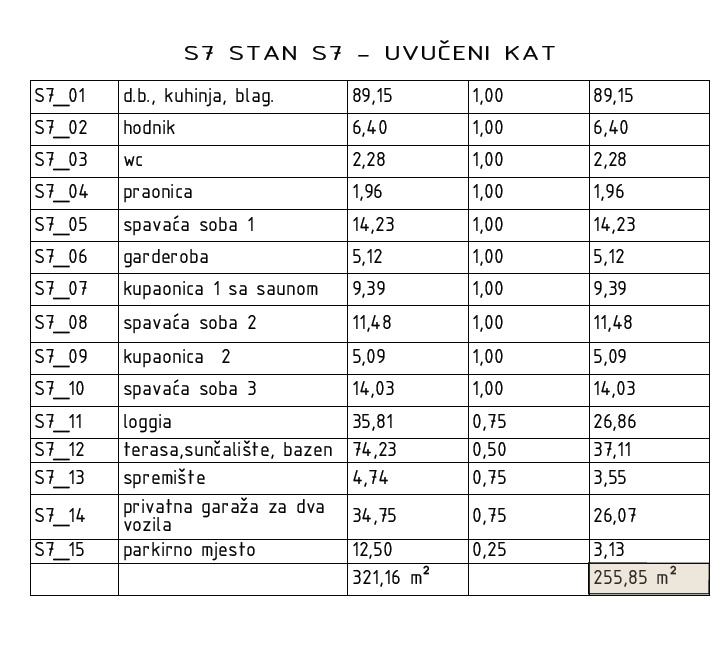 Stan se nalazi na trećem katu zgrade i ističe se svojim modernim dizajnom i visokom kvalitetom. S brutto površinom od 321,16 m2 i netto površinom od 255,85 m2, nudi vam prostranost i funkcionalnost za svakodnevni život.