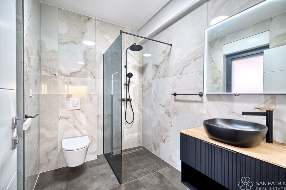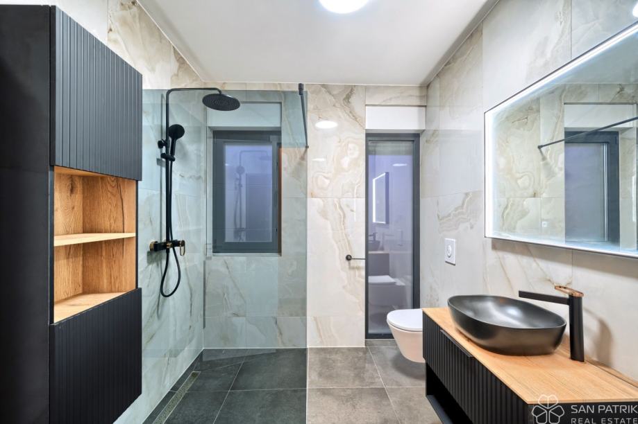 Na katu se nalaze tri luksuzno uređene spavaće sobe, svaka s vlastitom kupaonicom i garderobom, te privatnim terasama s kojih se pruža panoramski pogled na more i otoke, Gospu od Loreta te šarmantni Primošten u daljini.