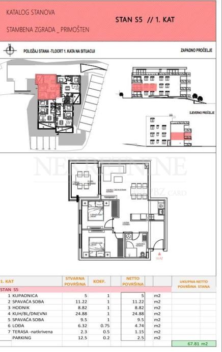 1. kat: 67.81 m2 (terasa 8.62 m2, 1 parking mjesto)