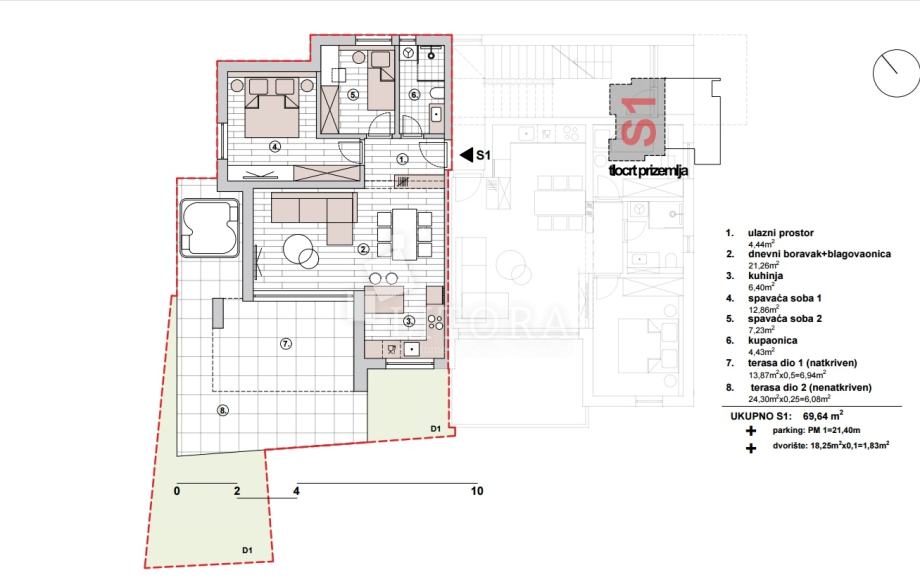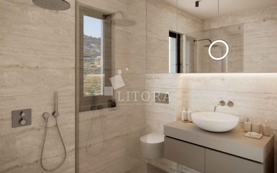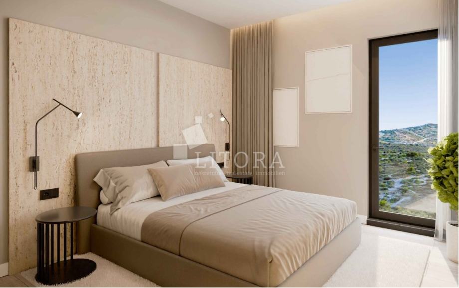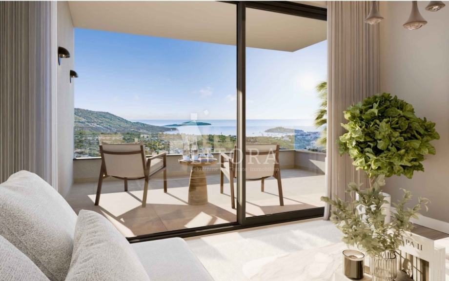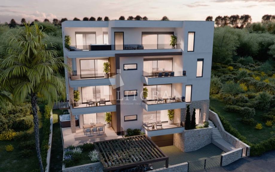 Primošten – Vrhunski opremljen apartman s jacuzzijem, prostranom terasom i panoramskim pogledom. Na mirnoj i uzdignutoj lokaciji iznad Primoštena, s prekrasnim panoramskim pogledom na more i slikovito mjesto, smješten je moderan apartman u visokom prizemlju novogradnje – projektirane po najvišim standardima suvremenog stanovanja. Zgrada se nalazi na idealnoj poziciji: lako dostupna automobilom, u blizini svih javnih sadržaja, a istovremeno dovoljno izdvojena za potpuni mir i privatnost. Apartman S1 ima 82,17m2 korisne površine, orijentiran je prema jugozapadu. Sastoji se od ulaznog hodnika, moderne kupaonice, dvije udobne spavaće sobe te dnevnog dijela s izlazom na prostranu terasu površine 38,27 m² na kojoj se nalazi jacuzzi. Dodatno, apartman ima i vlastiti dio dvorišta od 18,25 m² koji okružuje terasu. Apartman je projektiran s naglaskom na kvalitetu i komfor te uključuje: podno grijanje, vrhunsku aluminijsku/PVC stolariju s komarnicima i roletama na električne podizače, podne obloge od visoko kvalitetne keramike i prvoklasnog parketa, garažno parkirno mjesto od 21,40m2, uz mogućnost punjenja električnih ili hibridnih vozila (punionica već ugrađena). Zgrada je trenutno u fazi gradnje, a završetak i useljenje predviđeni su za ljeto 2026. godine. Udaljenost do prve plaže iznosi cca 1.250 m, a do centra Primoštena 1.800 m.