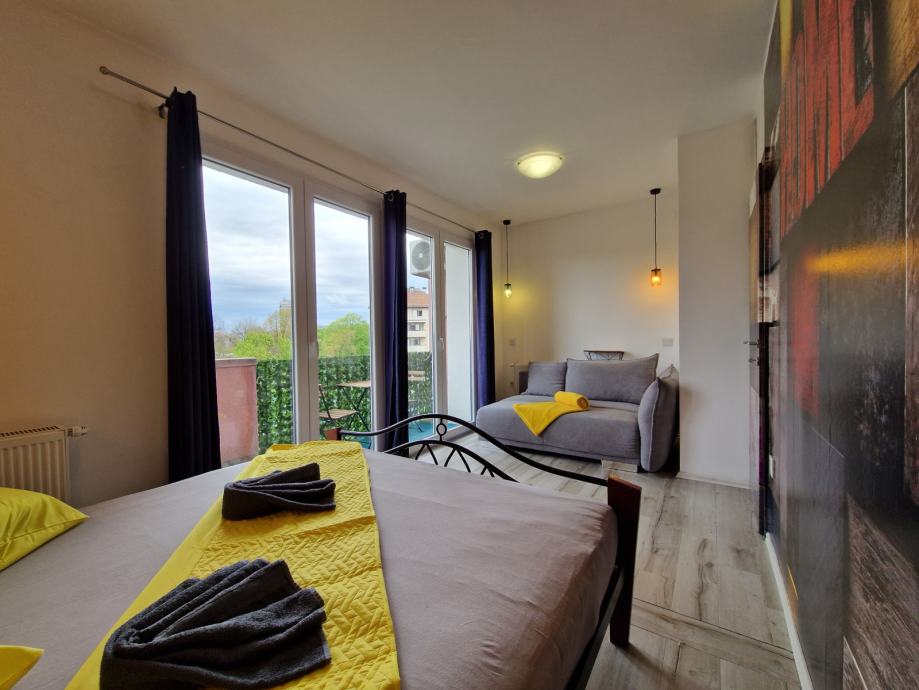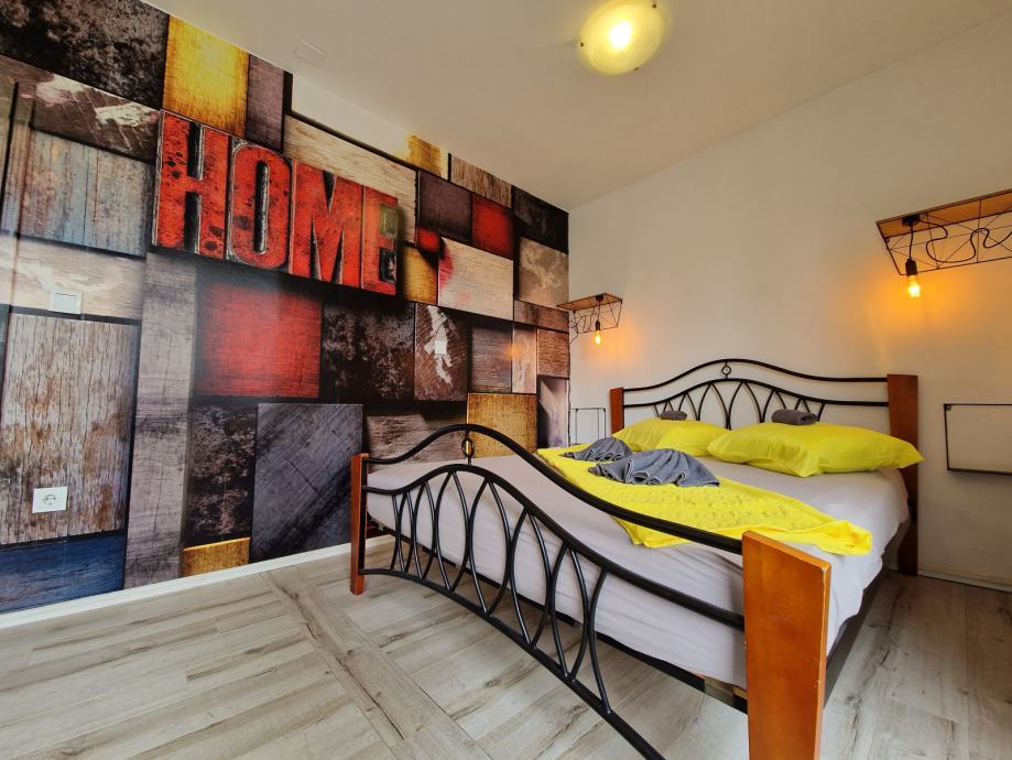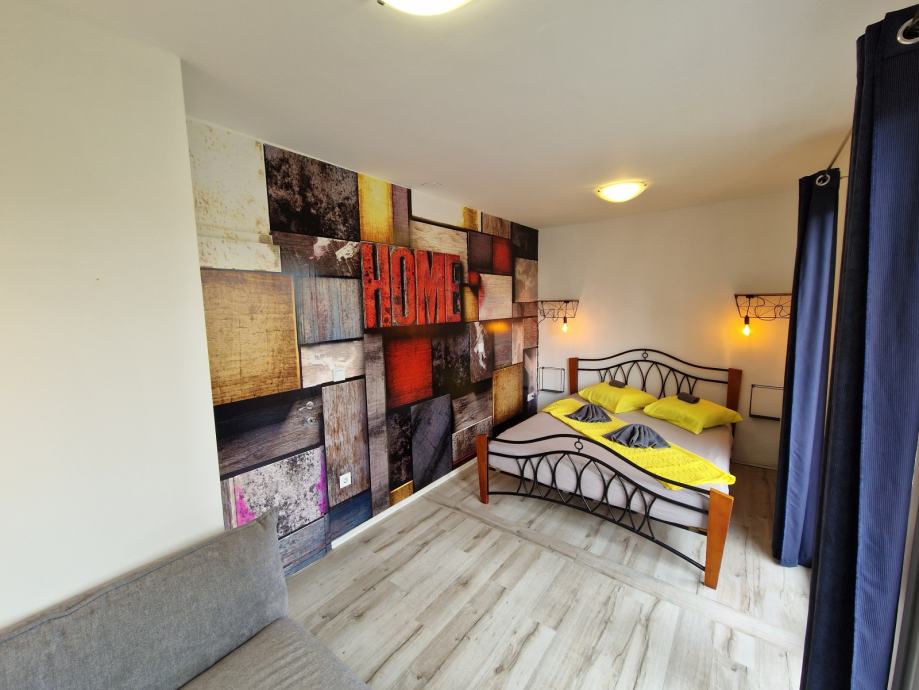 Ima odvojenu spavaću sobu s velikom krevetom (160x200).