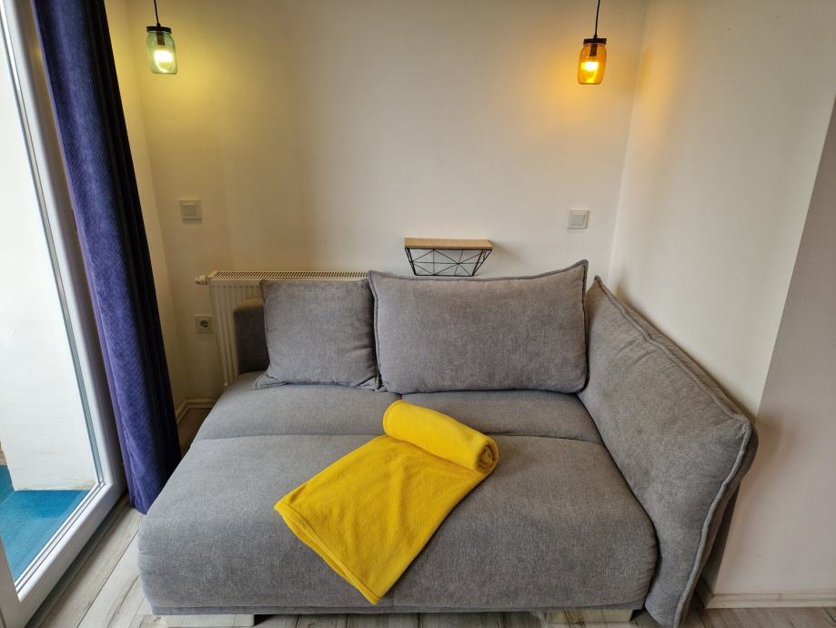 Stan se daje u najam sa posteljinom, ručnicima i posuđem.