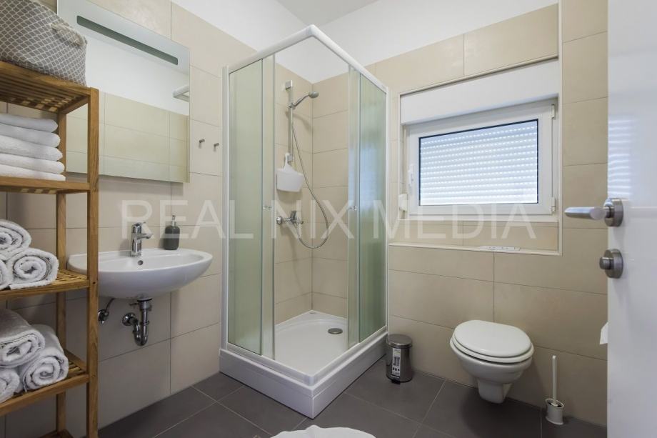 Apartman C6 nalazi se na drugom katu zgrade, svega 90 m do mora! Apartman se sastoji od kuhinje, blagovaonice, dnevnog boravka, wc-a, kupaonice, predsoblja, tri spavaće sobe i terase. Tlocrtna površina apartmana iznosi 78,85 m2, a netto korisna površina 76,38 m2.Zgrada se nalazi u samom centru mjesta, blizina svih potrebnih sadržaja! Uhodan turistički najam! Zgrada posjeduje svu potrebnu dokumentaciju! Vlasništvo 1/1, bez tereta!