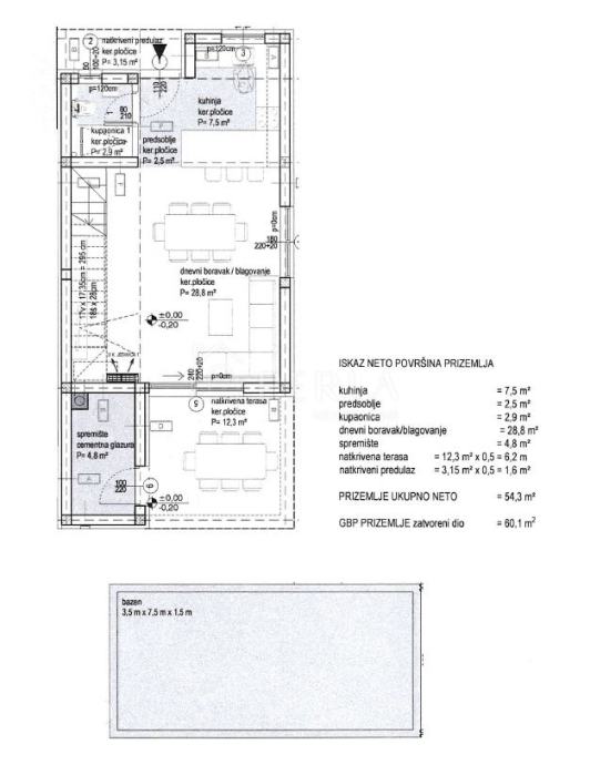 Prizemlju pripada predsoblje, prostrana kuhinja s blagovaonicom i dnevnim boravkom, kupaonica, spremište te natkrivena terasa.