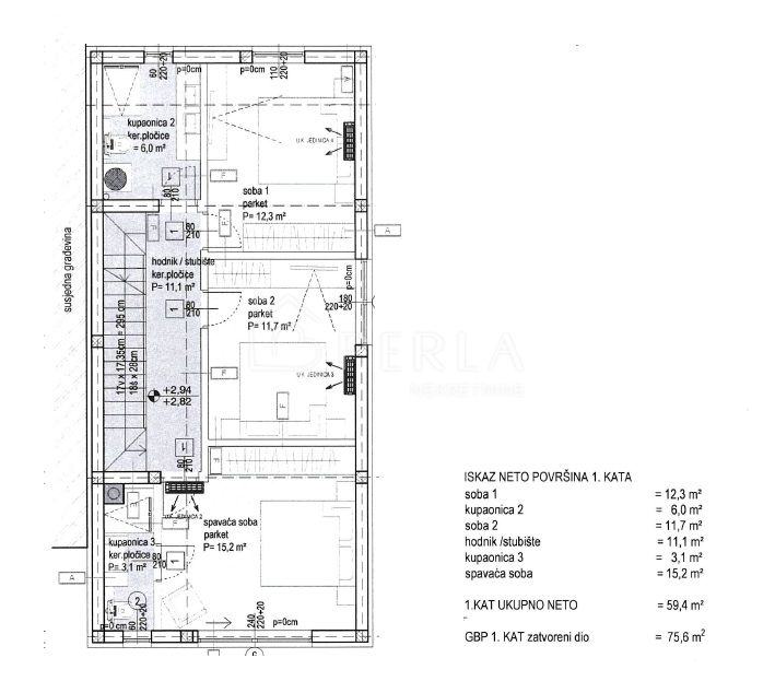 Prvom katu pripadaju hodnik/stubište, 3 spavaće sobe te 2 kupaonice.
