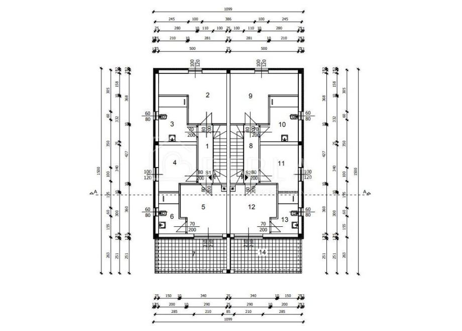 Kuća je dvojna i prodaje se polovica nekretnine označena rozim okvirom.